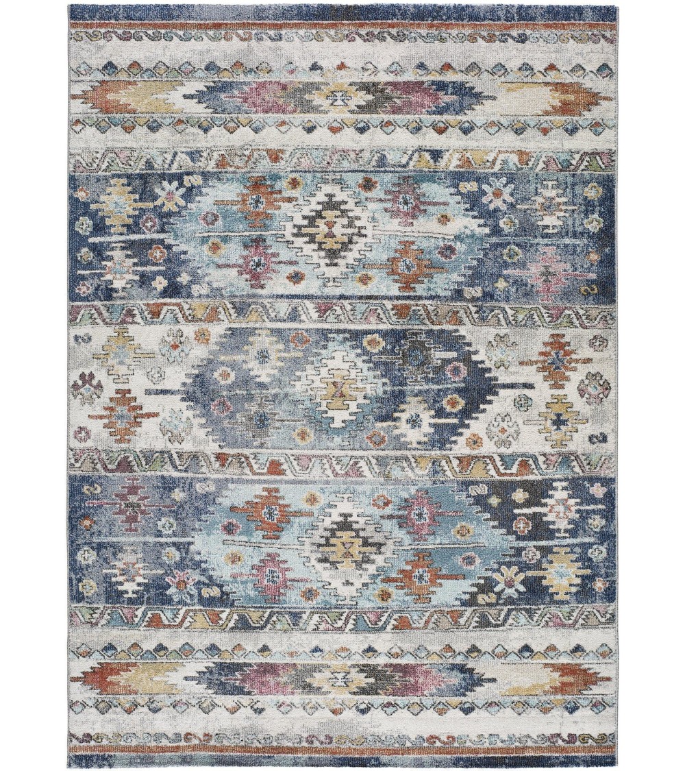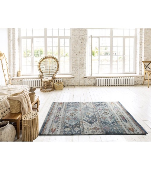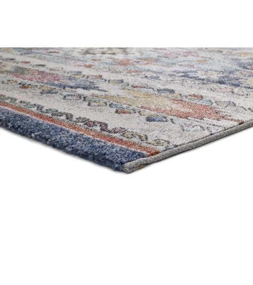Le tapis Mirva est un tapis de style ethnique vintage aux couleurs poudrées.Réalisé avec un tissage double face et avec une composition principale de - 100 pour cent polypropylène et jute sur l'envers.La densité de son tissage est de 224000 mailles/m2 et une hauteur de poils de 9 mm.