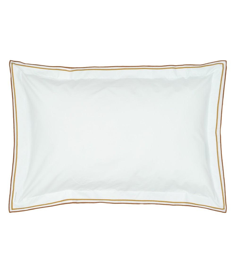 Le modèle Astor est un linge de lit blanc éclatant en percale de coton orné d'un élégant double volant et double surjet bicolore.Ce produit est vendu individuellement et peut être complété par d'autres unis ou d'autres articles coordonnés.La taie d'oreiller est blanc uni, ornée d'un surjet coloré et encadrée d'un double volant.