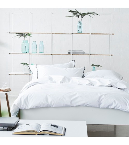 Le modèle Astor est un linge de lit blanc éclatant en percale de coton orné d'un élégant double volant et double surjet bicolore.Ce produit est vendu individuellement et peut être complété par d'autres unis ou d'autres articles coordonnés.La taie d'oreiller est blanc uni, ornée d'un surjet coloré et encadrée d'un double volant.
