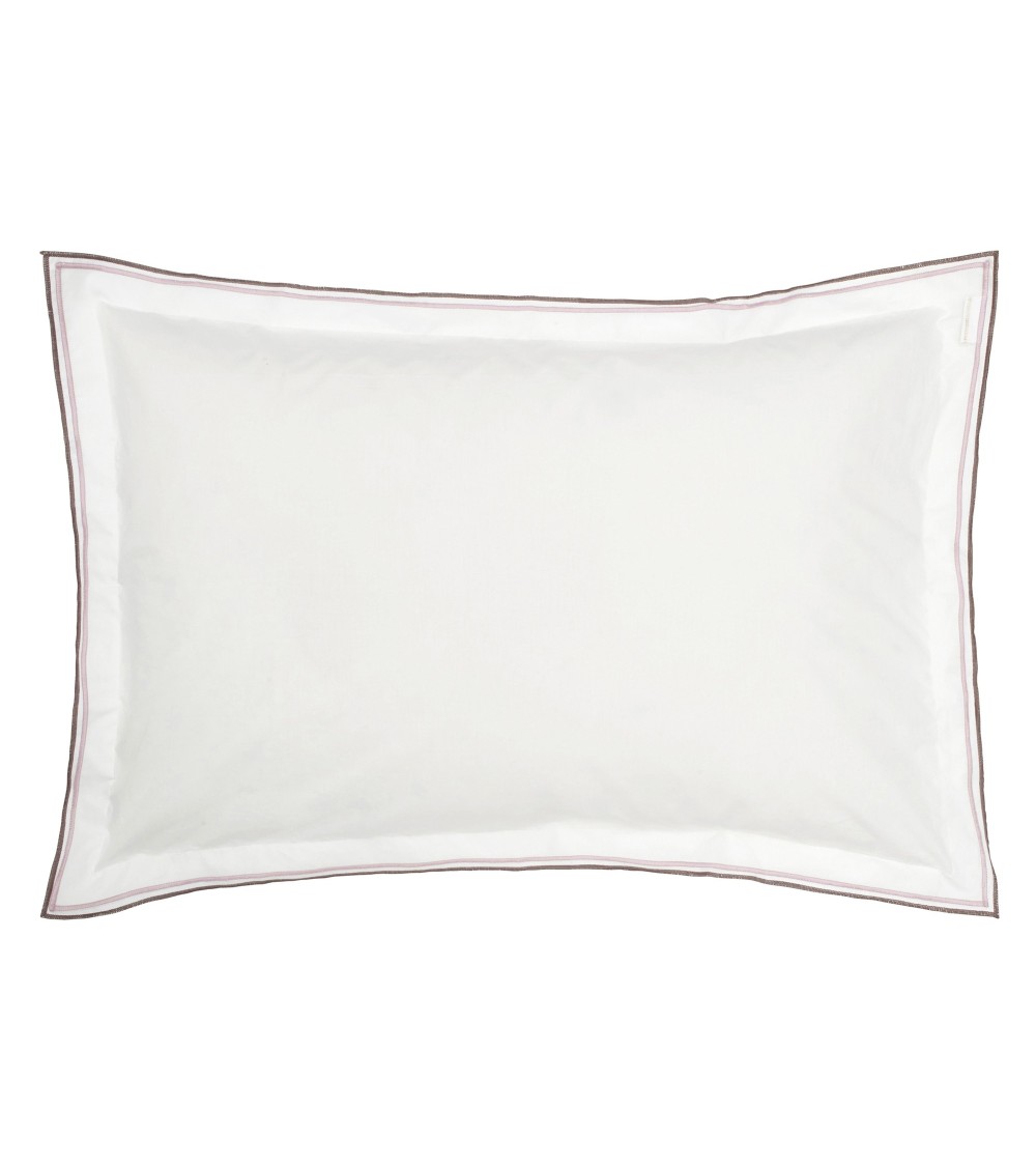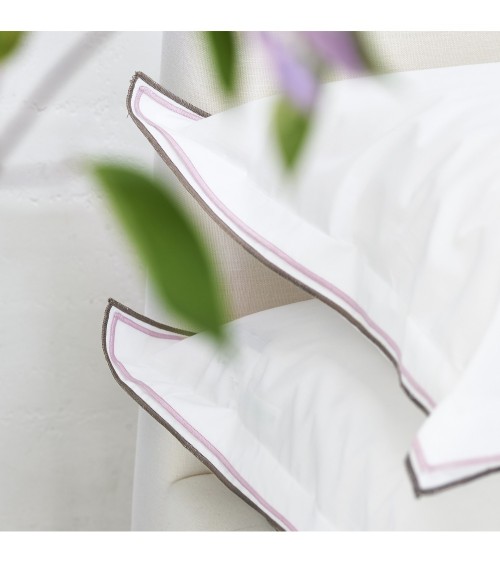 Le modèle Astor est un linge de lit blanc éclatant en percale de coton orné d'un élégant double volant et double surjet bicolore.Ce produit est vendu individuellement et peut être complété par d'autres unis ou d'autres articles coordonnés.La taie d'oreiller est blanc uni, ornée d'un surjet coloré et encadrée d'un double volant.