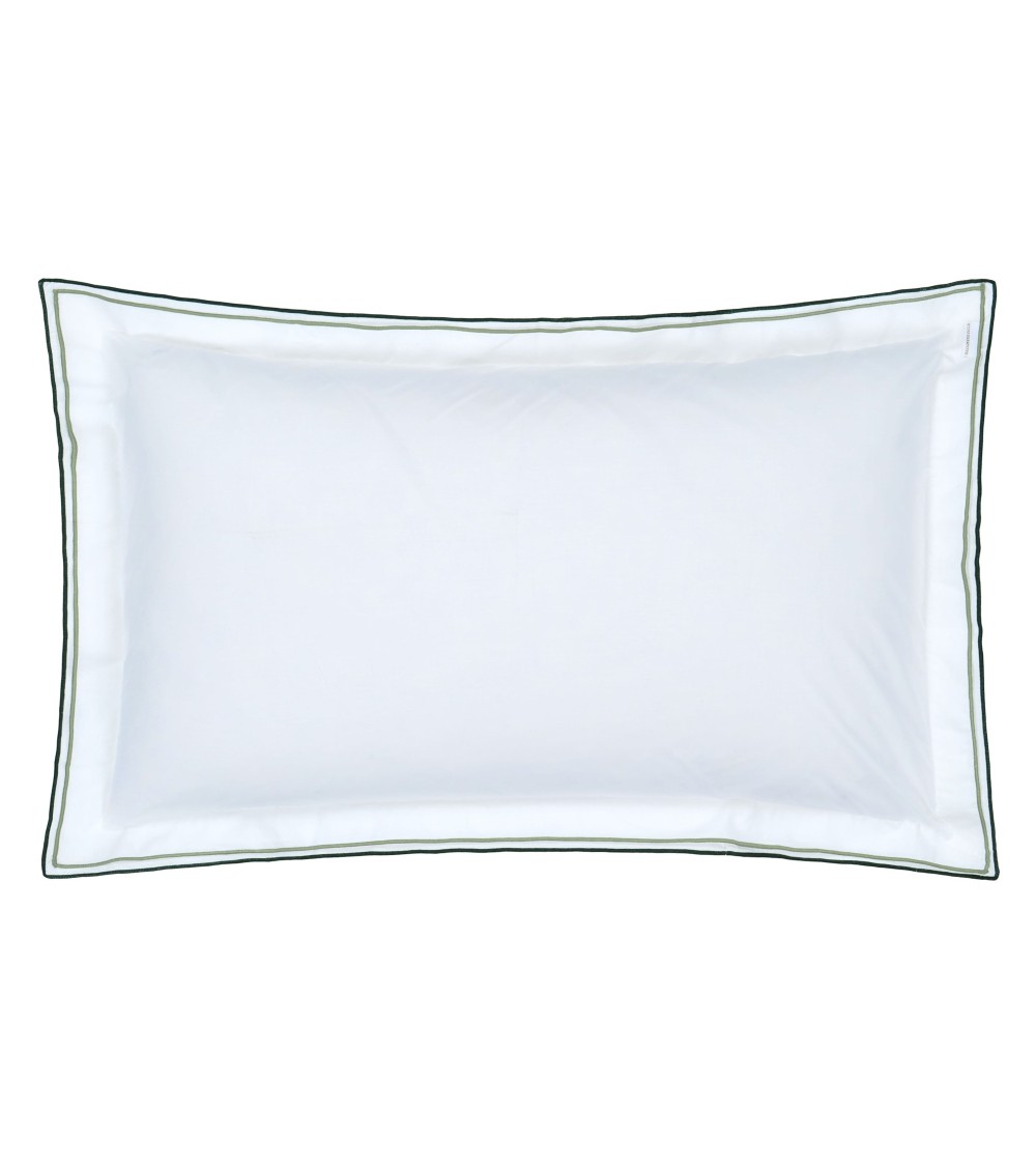 La taie d'oreiller blanc éclatant est orné d'un élégant double volant et double surjet bicolore dans des nuances de vert émeraude et de sauge. Imprimé en percale de coton.