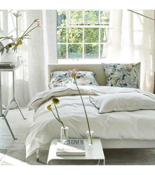 La taie d'oreiller blanc éclatant est orné d'un élégant double volant et double surjet bicolore dans des nuances de vert émeraude et de sauge. Imprimé en percale de coton.