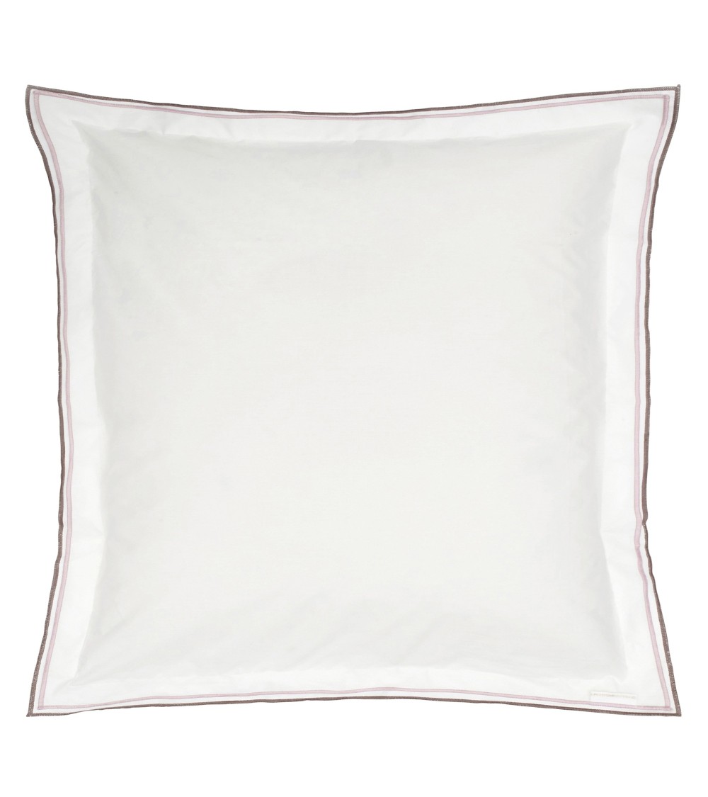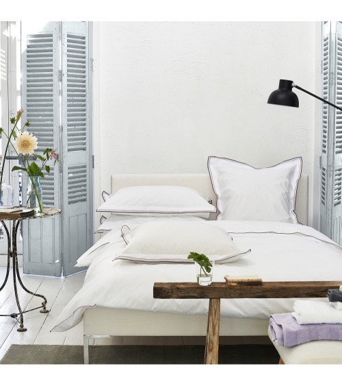 Le modèle Astor est un linge de lit blanc éclatant en percale de coton orné d'un élégant double volant et double surjet bicolore.Ce produit est vendu individuellement et peut être complété par d'autres unis ou d'autres articles coordonnés.La taie d'oreiller est blanc uni, ornée d'un surjet coloré et encadrée d'un double volant.
