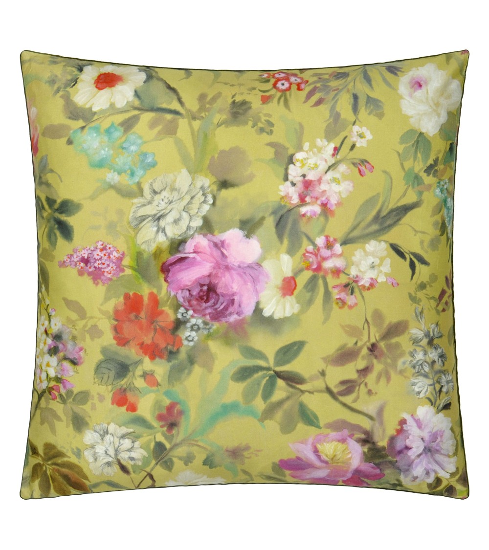 Taie décorative munie d'une composition de pivoines et de roses peintes dans des tonalités de rose, corail et de vert sur un fond ocre. Finition passepoil kaki.
