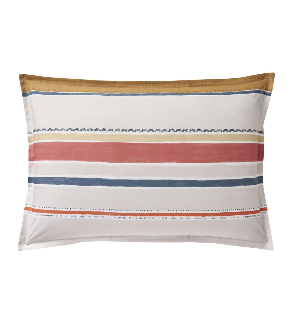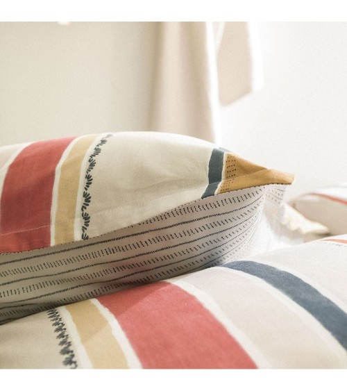 La taie doreiller ESCAPADE s'inspire dun après.midi ensoleillé dans une orangeraie marocaine. Ses rayures aux couleurs chaudes sur un fond blanc nous promettent une évasion et des futures balades sous le soleil. Le faux uni du revers aux rayures blanches très fines apporte une modernité à ce modèle de taie doreiller, ainsi quà tous les éléments de la parure. La taie est finie par un petit volant.