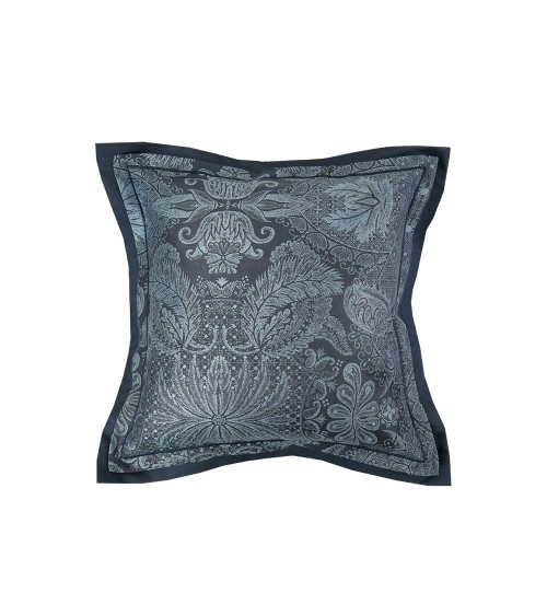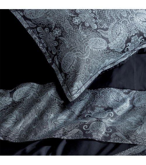 Luxueuse interprétation d'un best.seller de la collection héritage de Garnier.Thiebaut. Une taie 100 pour cent coton au lustre soyeux et énigmatique, équilibre harmonieux entre classicisme et modernité. Verso de la taie d'oreiller en satin uni bleu nuit 120 fils/cm2. Drap housse en satin uni assorti - Ava uni bleu nuit Matière - satin de coton peigné 130 fils/cm². Couleur dominante - diamant noir. Taille (largeur x longueur) - 63x63. Traitement - . Type - jacquard. Style - Prestige. Finitions - double volant et bourdon bleu nuit sur l'encadrement ; les taies 50x70 et 63x63 ont une fermeture rabat ; les taies 40x40, 40x80 et 80x80 ont une fermeture zip. Grammage - . Entretien - Avant la première utilisation, laver les articles seuls, à 30degrés avec une demi.dose de lessive.Nous préconisons l'emploi de lessive liquide en respectant le dosage prescrit par le fabricant.Cet article est labellisé Vosges Terre Textile. Il a été tissé dans nos ateliers de Gérardmer - véritable linge fabriqué dans les Vosges !
