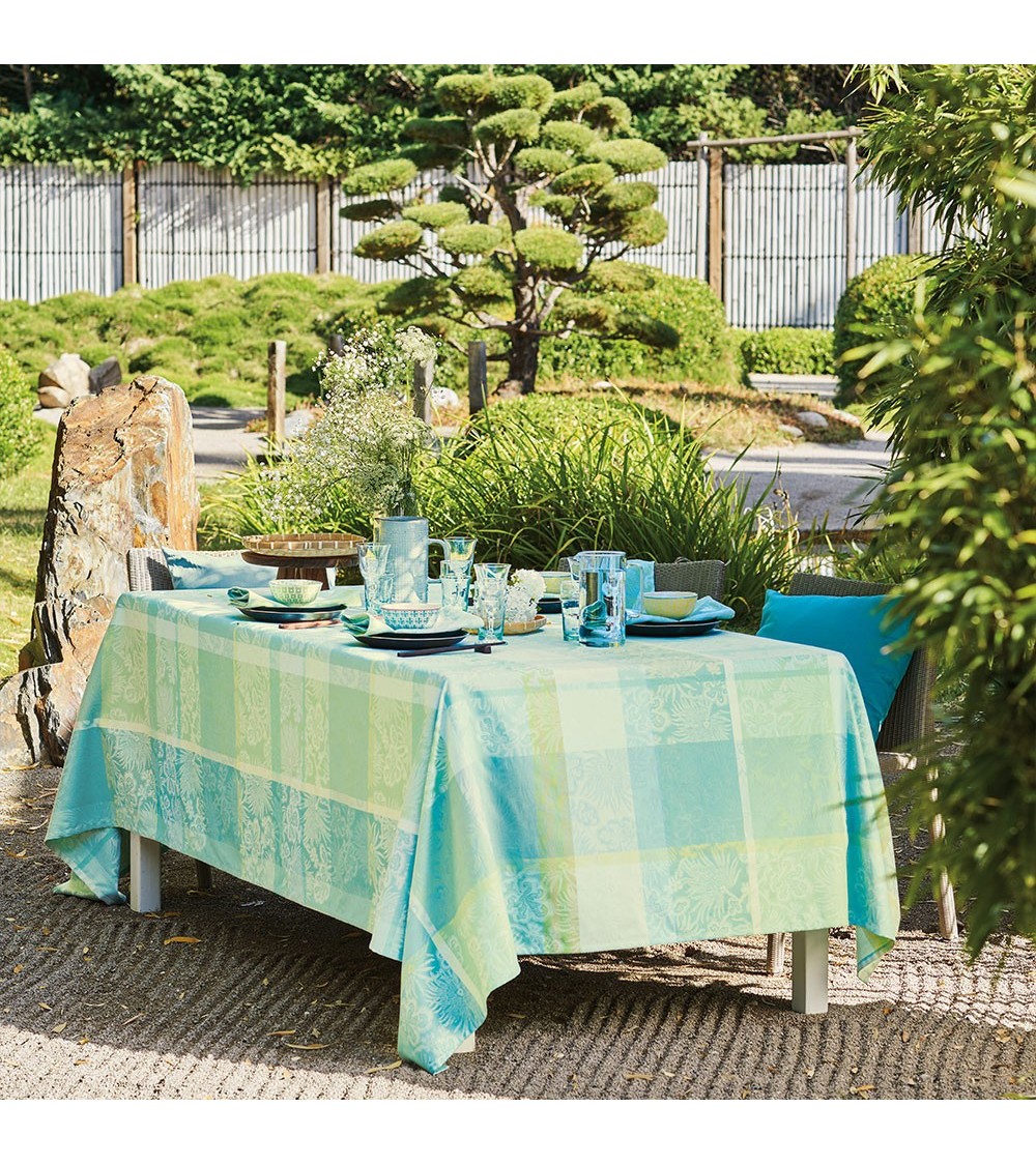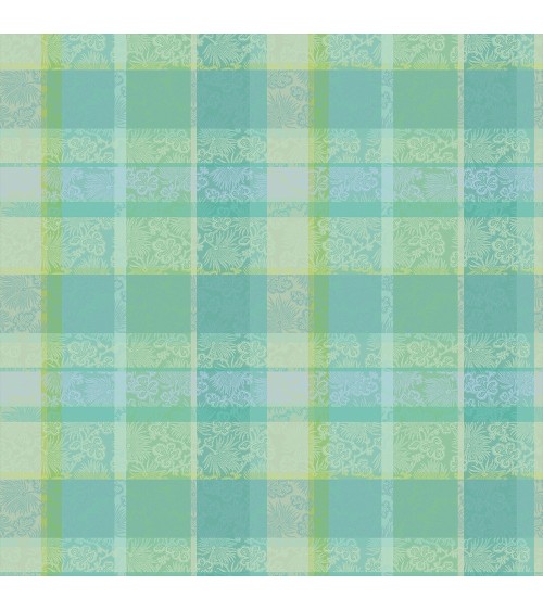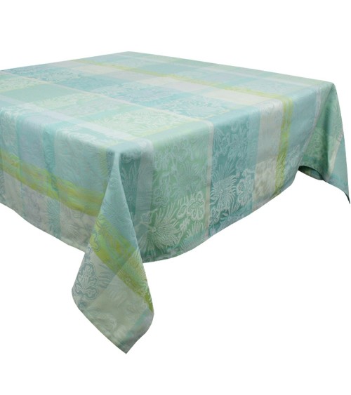 Nappe 100 pour cent coton damassé (jacquard) fabriquée en France à Gérardmer. Linge des Vosges. Matière - 100 pour cent coton peigné. Couleur dominante - aqua. Taille (largeur x longueur) - 180x180. Traitement - . Type - jacquard. Style - Fleurs et nature. Finitions - Finition de qualité avec ourlets standards 15 mm. Grammage - . Entretien - Laver séparément à 40degrés avant la première utilisation. Une tache s'incruste plus facilement sur un linge non prélavé.Laver en machine avec une lessive couleurs pour le linge de couleur. Respecter les instructions de lavage de l'étiquette cousue sur le produit.Cet article est labellisé Vosges Terre Textile. Il a été tissé dans nos ateliers de Gérardmer - véritable linge fabriqué dans les Vosges !