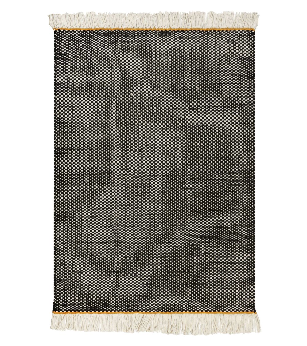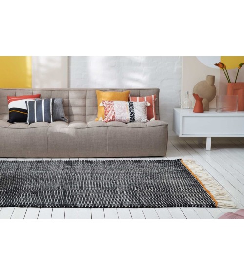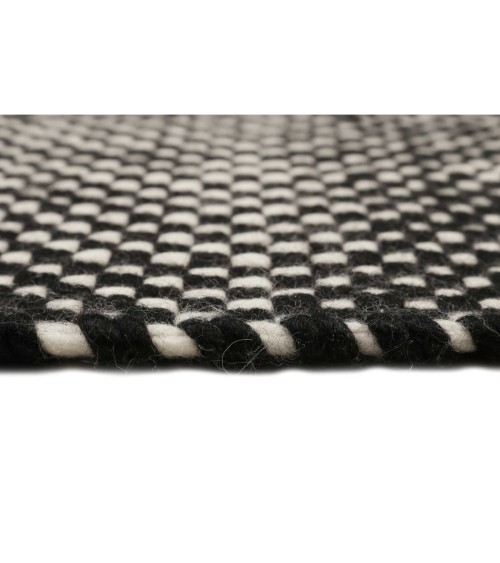 Tapis plat tissé main pure laine vierge à franges noir 160x230