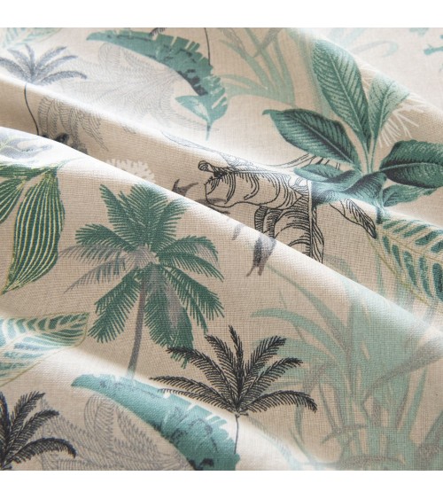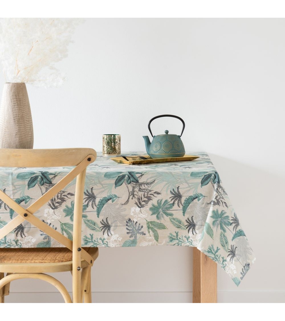 Nappe en coton enduit imprimé feuillage bleu vert, vert et noir, OEKO-TEX® 150x250