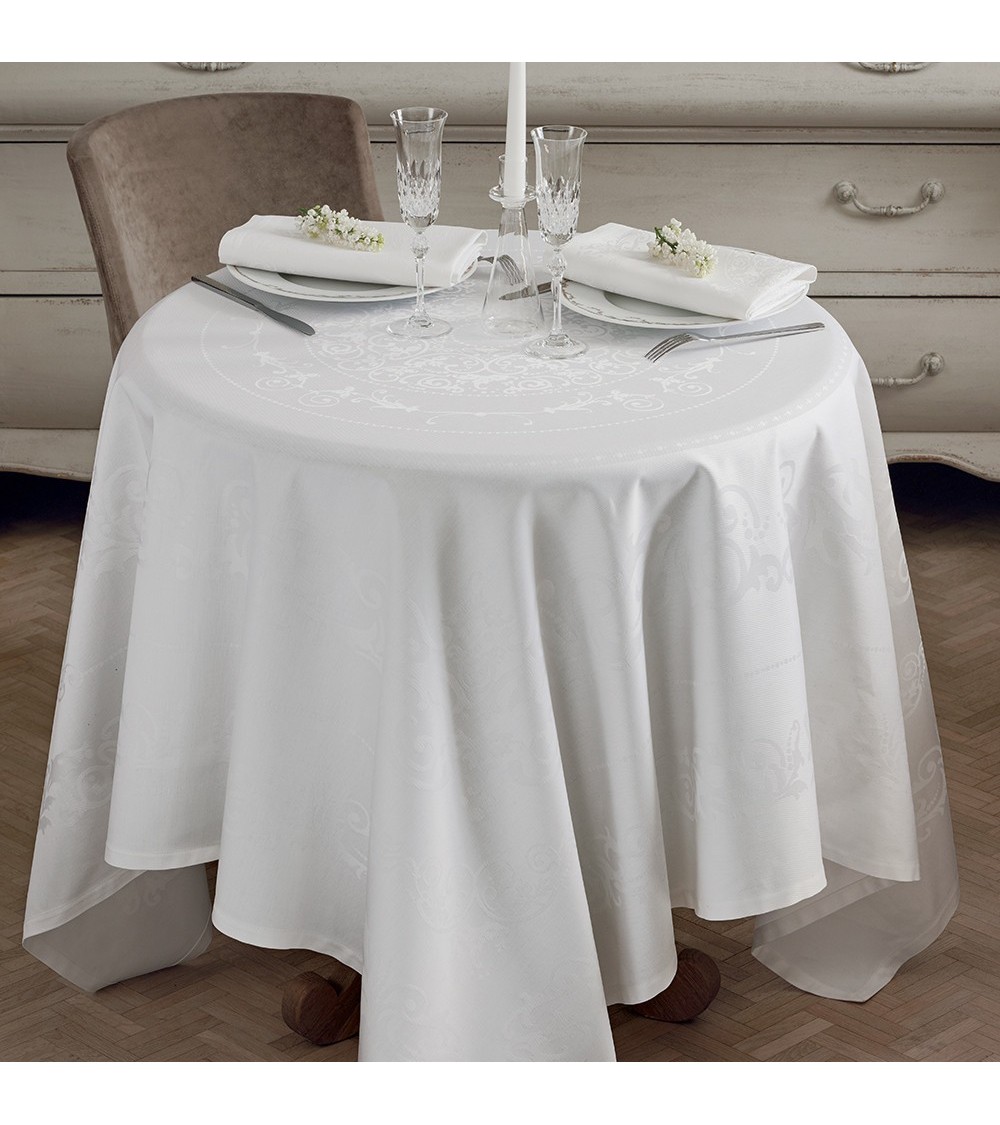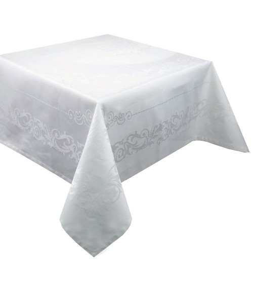 Nappe 100 pour cent coton damassé (jacquard) fabriquée en France à Gérardmer. Linge des Vosges. Cette nappe bénéficie du traitement anti.tache Green Sweet - votre linge de table reste propre et net. Matière - 100 pour cent coton peigné. Couleur dominante - blanc. Taille (largeur x longueur) - 174X254. Traitement - antitache déperlant. Type - jacquard. Style - Prestige. Finitions - Finitions raffinées avec coins capuchon. Ourlet de 15 mm pour les nappes rondes.. Grammage - . Entretien - En cas de tache, absorber délicatement les liquides ou tamponner avec une éponge humide après avoir retiré les éventuels éléments solides.Si nécessaire, laver en machine à 40degrés avec un dosage de lessive normal. Sans adoucissant, ni détachant ni lingette de nettoyage.Sécher à température modérée.Repasser à fer très chaud, afin de réactiver la qualité du traitement.Cet article est labellisé Vosges Terre Textile. Il a été tissé dans nos ateliers de Gérardmer - véritable linge fabriqué dans les Vosges !
