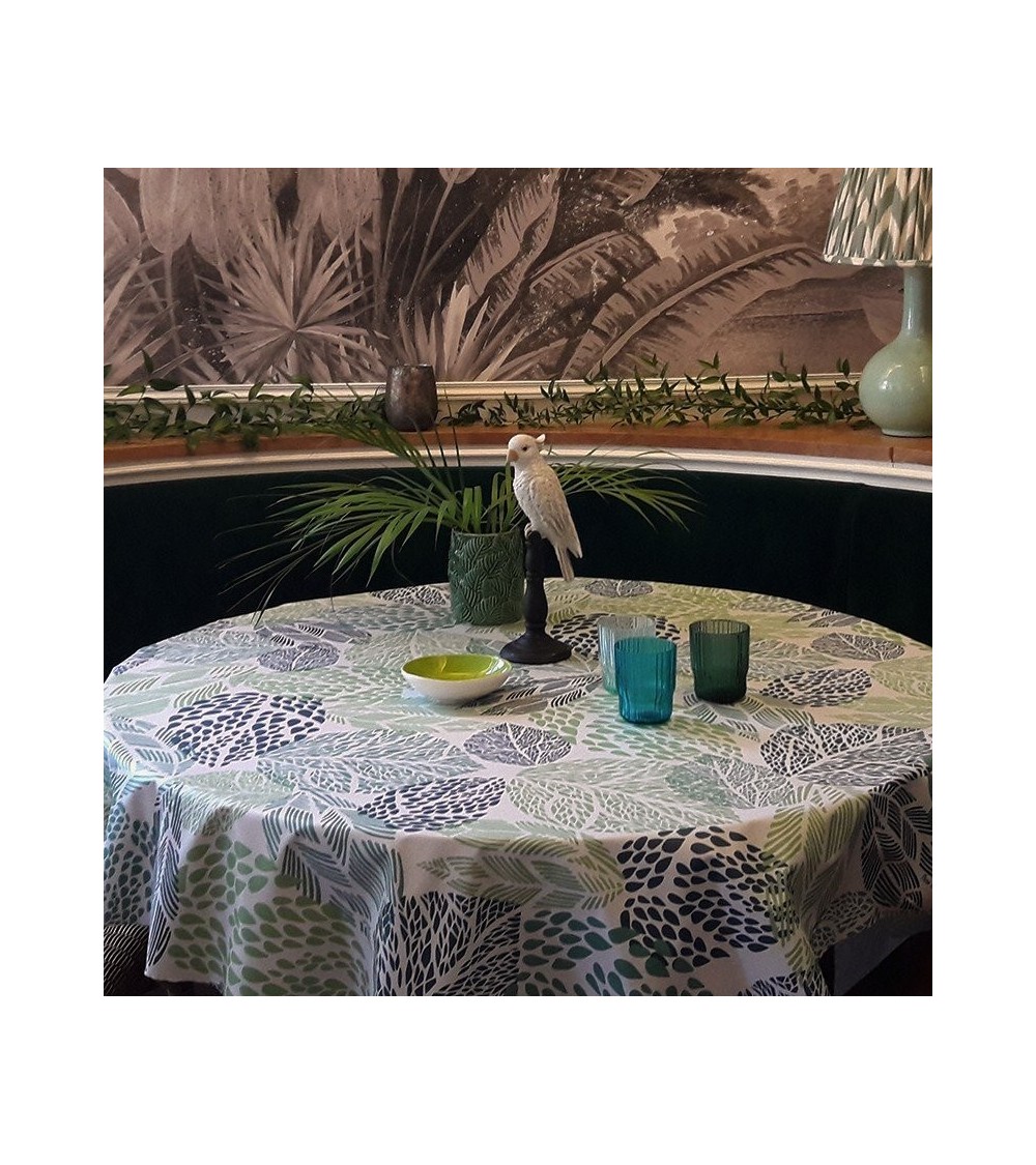 Matière - Coton enduit . Finition - Ourlée . '' La collection Feuille est issue d'un travail de sérigraphie et du jeu d'ombre des feuilles dans la nature. Ce camaïeu de verts apporte un côté végétal, jungle au tissu. Le motif est décliné en 2 coloris. Nappe de table imperméable et anti.tache - La Nappe enduite ronde ou ovale Feuilles vertes Fleur de Soleil est réalisée en coton enduit de haute qualité et résiste aux taches de toute la famille (vin, café, chocolat, sauce tomate, huile...) Fabrication 100 pour cent française - Le tissu Fleur de Soleil est tissé, blanchi, imprimé et enduit dans les Vosges, à Gérardmer. Tissu écologique - Impression du tissu certifiée Oeko.Tex classe I (les bébés peuvent le mettre à la bouche), enduction sans produits toxiques, sans PVC, sans phtalates Entreprise socialement responsable - les commandes sont réalisées et expédiées par un ESAT (Etablissement Spécialisé d'Aide par le travail) permettant à des handicapés de travailler en milieu ''protégé''. Nappe facile d'entretien - La Nappe enduite ronde ou ovale Feuilles vertes s'entretient d'un coup d'éponge humide après chaque repas. Vinaigre d'alcool ou eau de Javel pour bien nettoyer. Lavage en machine possible occasionnellement à 30 C sans produit adoucissant ni essorage. Repassage obligatoire sur l'envers en position coton ou sur l'endroit avec une patte.mouille.