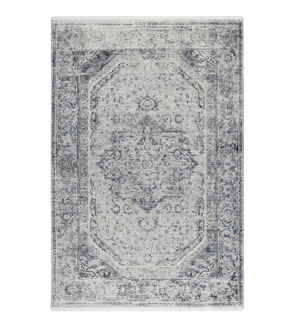 Tapis vintage bohème à poils ras et franges gris bleu beige 190x130