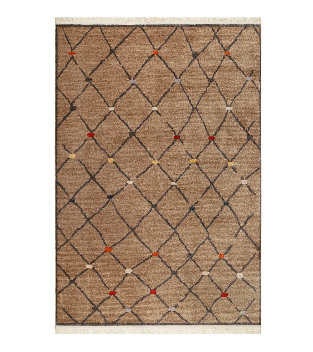 Tapis tissé ethnique chic à franges multicolore fond marron 133x200