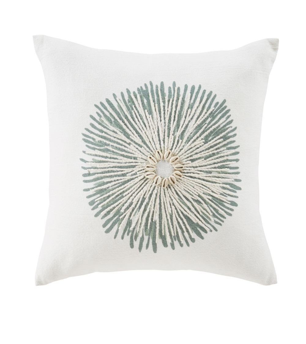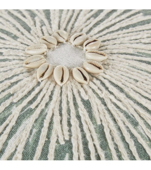 On aime lesprit nature du coussin IMATRANA ! Très frais, ce coussin écru brodé de vert a des petits coquillages brodés à la main au centre pour un style bord de mer affirmé. Imaginé par nos stylistes, il est garni de polyester recyclé, plus respectueux de lenvironnement.