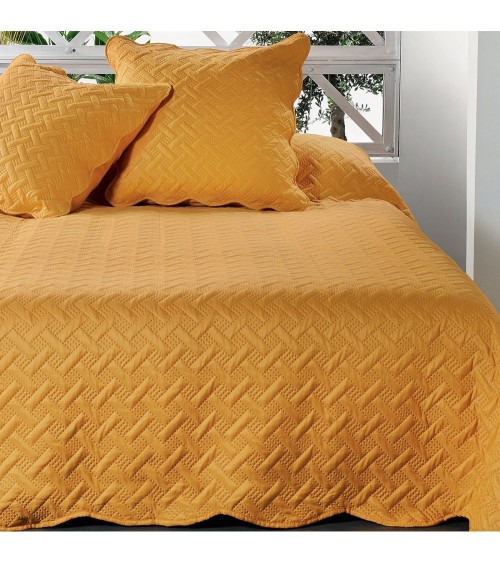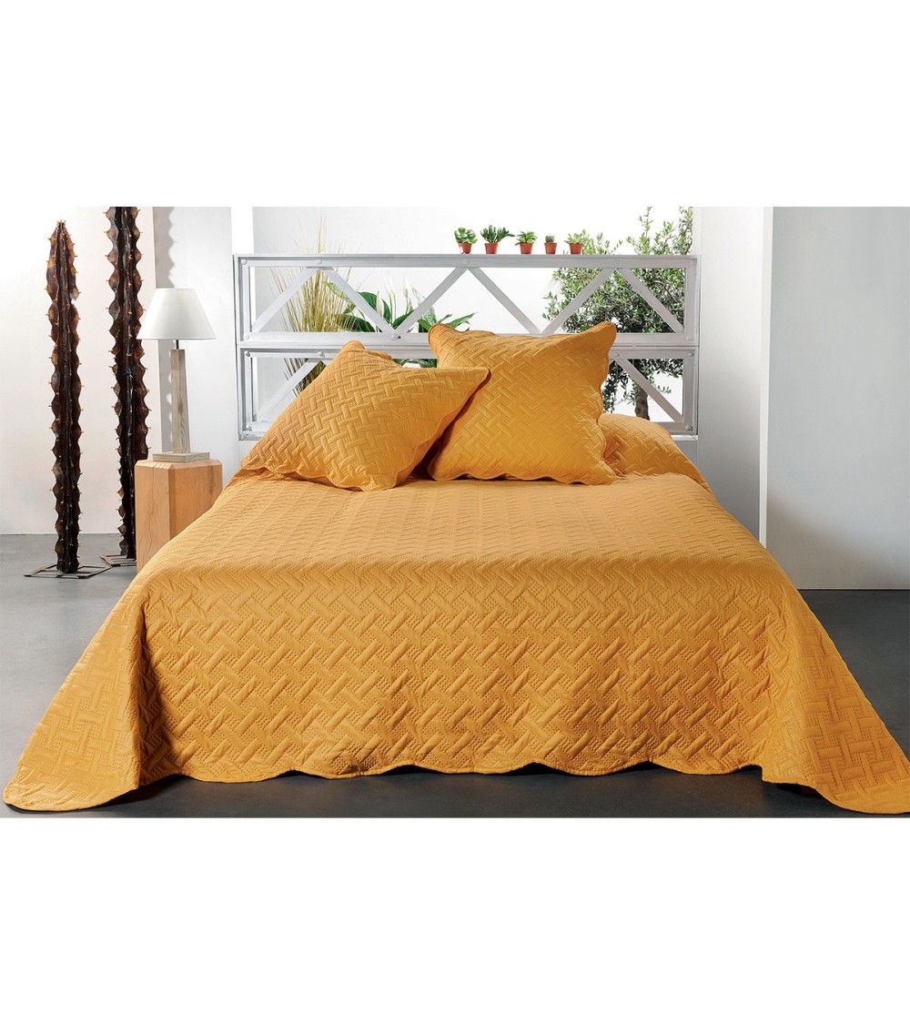 Laissez vous transporter par ce jeté de lit surpiqué aux formes géométriques originales accompagné de sa ou ses taies assorties. Les coloris unis et tendance sauront s'imposer dans votre espace nuit avec style. . Caractéristiques :. Dimensions : 180x240cm (1 taie), 230x250cm, 250x260cm (2 taies). Coloris : écru, jaune, brique, vert, gris clair, marine. Composition : 100% polyester. Entretien : Lavage en machine à 30°C. . Vendu à l'unité (jeté de lit+ taie)