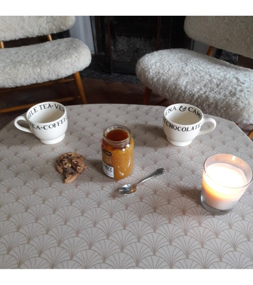 Matière : Coton enduit - Finition : Ourlée - La collection Papyrus donne un côté chic et art déco à vos intérieurs. Nappe de table imperméable et anti-tache : La Nappe enduite Papyrus nacre Fleur de Soleil est réalisée en coton enduit de haute qualité et résiste aux taches de toute la famille (vin, café, chocolat, sauce tomate, huile...) Fabrication 100% française : Le tissu Fleur de Soleil est tissé, blanchi, imprimé et enduit dans les Vosges, à Gérardmer. Tissu écologique : Impression du tissu certifiée Oeko-Tex classe I (les bébés peuvent le mettre à la bouche), enduction sans produits toxiques, sans PVC, sans phtalates Entreprise socialement responsable : les commandes sont réalisées et expédiées par un ESAT (Etablissement Spécialisé d'Aide par le travail) permettant à des handicapés de travailler en milieu ''protégé''. Nappe facile d'entretien : La Nappe enduite Papyrus nacre s'entretient d'un coup d'éponge humide après chaque repas. Vinaigre d'alcool ou eau de Javel pour bien nettoyer. Lavage en machine possible occasionnellement à 30 C sans produit adoucissant ni essorage. Repassage obligatoire sur l'envers en position coton ou sur l'endroit avec une patte-mouille.
