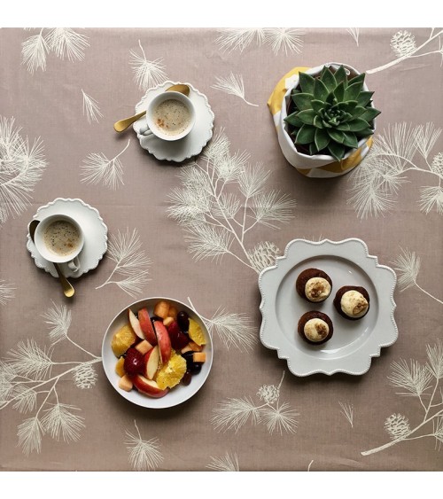 Matière : Coton enduit - Finition : Non ourlée (coupe franche) - La collection Pin a été dessinée au trait de crayon en s'inspirant d'une branche de pin dans la nature. Ici en beige, on plonge directement dans la forêt ou dans les massifs alpins. Le motif est décliné en 2 coloris. Nappe de table imperméable et anti-tache : La Nappe enduite Pin Beige Fleur de Soleil est réalisée en coton enduit de haute qualité et résiste aux taches de toute la famille (vin, café, chocolat, sauce tomate, huile...) Fabrication 100% française : Le tissu Fleur de Soleil est tissé, blanchi, imprimé et enduit dans les Vosges, à Gérardmer. Tissu écologique : Impression du tissu certifiée Oeko-Tex classe I (les bébés peuvent le mettre à la bouche), enduction sans produits toxiques, sans PVC, sans phtalates Entreprise socialement responsable : les commandes sont réalisées et expédiées par un ESAT (Etablissement Spécialisé d'Aide par le travail) permettant à des handicapés de travailler en milieu ''protégé''. Nappe facile d'entretien : La Nappe enduite Pin Beige s'entretient d'un coup d'éponge humide après chaque repas. Vinaigre d'alcool ou eau de Javel pour bien nettoyer. Lavage en machine possible occasionnellement à 30 C sans produit adoucissant ni essorage. Repassage obligatoire sur l'envers en position coton ou sur l'endroit avec une patte-mouille.