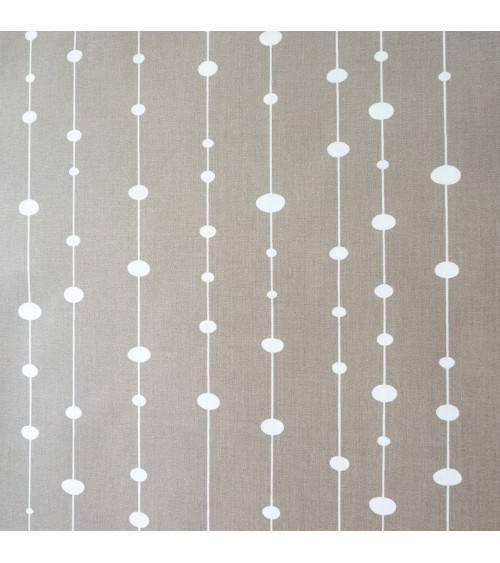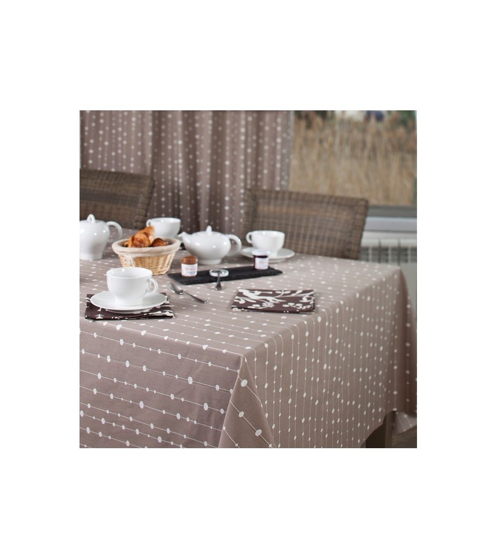 Matière : Coton enduit - Finition : Non ourlée (coupe franche) - Nappe de table imperméable et anti-tache : La Nappe enduite Perles taupe Fleur de Soleil est réalisée en coton enduit de haute qualité et résiste aux taches de toute la famille (vin, café, chocolat, sauce tomate, huile...) Fabrication 100% française : Le tissu Fleur de Soleil est tissé, blanchi, imprimé et enduit dans les Vosges, à Gérardmer. Tissu écologique : Impression du tissu certifiée Oeko-Tex classe I (les bébés peuvent le mettre à la bouche), enduction sans produits toxiques, sans PVC, sans phtalates Entreprise socialement responsable : les commandes sont réalisées et expédiées par un ESAT (Etablissement Spécialisé d'Aide par le travail) permettant à des handicapés de travailler en milieu ''protégé''. Nappe facile d'entretien : La Nappe enduite Perles taupe s'entretient d'un coup d'éponge humide après chaque repas. Vinaigre d'alcool ou eau de Javel pour bien nettoyer. Lavage en machine possible occasionnellement à 30 C sans produit adoucissant ni essorage. Repassage obligatoire sur l'envers en position coton ou sur l'endroit avec une patte-mouille.