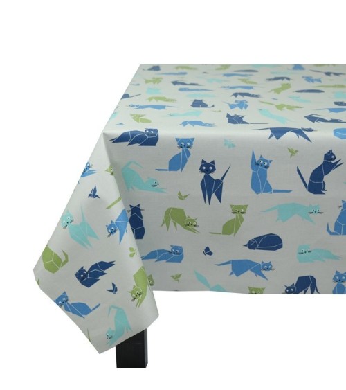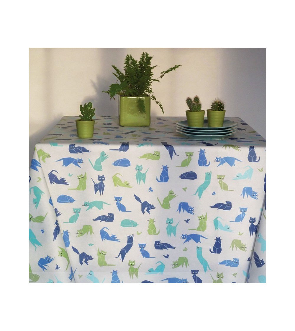 Matière : Coton enduit - Finition : Non ourlée (coupe franche) - La collection Chat est intemporelle et pourtant les chats reviennent sur le devant des catalogues de déco! Mignons, réconfortants les chats sont aimés ou détestés mais surtout ils plaisent aussi bien aux enfants qu'aux plus grands! Ici en taupe, le motif Chat est déclinés dans 2 autres coloris. Nappe de table imperméable et anti-tache : La Nappe enduite Chats bleus Fleur de Soleil est réalisée en coton enduit de haute qualité et résiste aux taches de toute la famille (vin, café, chocolat, sauce tomate, huile...) Fabrication 100% française : Le tissu Fleur de Soleil est tissé, blanchi, imprimé et enduit dans les Vosges, à Gérardmer. Tissu écologique : Impression du tissu certifiée Oeko-Tex classe I (les bébés peuvent le mettre à la bouche), enduction sans produits toxiques, sans PVC, sans phtalates Entreprise socialement responsable : les commandes sont réalisées et expédiées par un ESAT (Etablissement Spécialisé d'Aide par le travail) permettant à des handicapés de travailler en milieu ''protégé''. Nappe facile d'entretien : La Nappe enduite Chats bleus s'entretient d'un coup d'éponge humide après chaque repas. Vinaigre d'alcool ou eau de Javel pour bien nettoyer. Lavage en machine possible occasionnellement à 30 C sans produit adoucissant ni essorage. Repassage obligatoire sur l'envers en position coton ou sur l'endroit avec une patte-mouille.