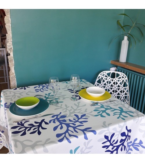 Matière : Coton enduit - Finition : Ourlée - La collection Corail prend des airs de tableau de Matisse. On y voit des formes abstraites ou bien des coraux pour un esprit bord de mer moderne et original. Ici, en rouge, le motif Corail est également décliné en 2 autres coloris. Nappe de table imperméable et anti-tache : La Nappe enduite ronde ou ovale Corail bleu Fleur de Soleil est réalisée en coton enduit de haute qualité et résiste aux taches de toute la famille (vin, café, chocolat, sauce tomate, huile...) Fabrication 100% française : Le tissu Fleur de Soleil est tissé, blanchi, imprimé et enduit dans les Vosges, à Gérardmer. Tissu écologique : Impression du tissu certifiée Oeko-Tex classe I (les bébés peuvent le mettre à la bouche), enduction sans produits toxiques, sans PVC, sans phtalates Entreprise socialement responsable : les commandes sont réalisées et expédiées par un ESAT (Etablissement Spécialisé d'Aide par le travail) permettant à des handicapés de travailler en milieu ''protégé''. Nappe facile d'entretien : La Nappe enduite ronde ou ovale Corail bleu s'entretient d'un coup d'éponge humide après chaque repas. Vinaigre d'alcool ou eau de Javel pour bien nettoyer. Lavage en machine possible occasionnellement à 30 C sans produit adoucissant ni essorage. Repassage obligatoire sur l'envers en position coton ou sur l'endroit avec une patte-mouille.