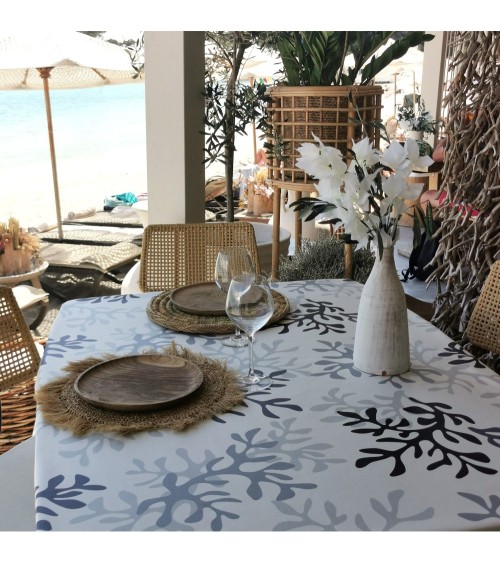 Matière : Coton enduit - Finition : Ourlée - '' La collection Corail prend des airs de tableau de Matisse. On y voit des formes abstraites ou bien des coraux pour un esprit bord de mer moderne et original. Ici, en gris et noir, le motif Corail est également décliné en 2 autres coloris. Nappe de table imperméable et anti-tache : La Nappe enduite ronde ou ovale Corail noir Fleur de Soleil est réalisée en coton enduit de haute qualité et résiste aux taches de toute la famille (vin, café, chocolat, sauce tomate, huile...) Fabrication 100% française : Le tissu Fleur de Soleil est tissé, blanchi, imprimé et enduit dans les Vosges, à Gérardmer. Tissu écologique : Impression du tissu certifiée Oeko-Tex classe I (les bébés peuvent le mettre à la bouche), enduction sans produits toxiques, sans PVC, sans phtalates Entreprise socialement responsable : les commandes sont réalisées et expédiées par un ESAT (Etablissement Spécialisé d'Aide par le travail) permettant à des handicapés de travailler en milieu ''protégé''. Nappe facile d'entretien : La Nappe enduite ronde ou ovale Corail noir s'entretient d'un coup d'éponge humide après chaque repas. Vinaigre d'alcool ou eau de Javel pour bien nettoyer. Lavage en machine possible occasionnellement à 30 C sans produit adoucissant ni essorage. Repassage obligatoire sur l'envers en position coton ou sur l'endroit avec une patte-mouille.