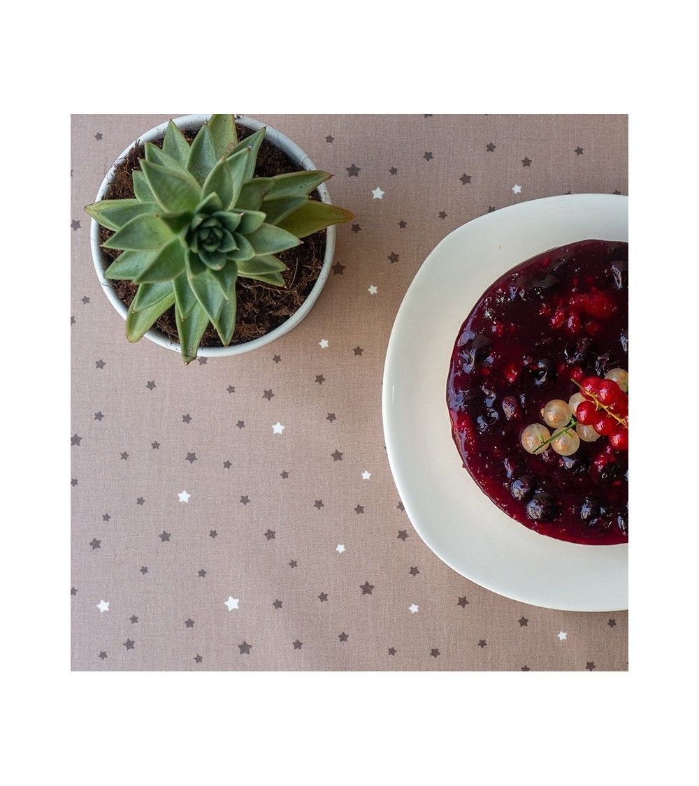 Matière : Coton enduit - Finition : Ourlée - Nappe de table imperméable et anti-tache : La Nappe enduite ronde ou ovale Etoiles taupe Fleur de Soleil est réalisée en coton enduit de haute qualité et résiste aux taches de toute la famille (vin, café, chocolat, sauce tomate, huile...) Fabrication 100% française : Le tissu Fleur de Soleil est tissé, blanchi, imprimé et enduit dans les Vosges, à Gérardmer. Tissu écologique : Impression du tissu certifiée Oeko-Tex classe I (les bébés peuvent le mettre à la bouche), enduction sans produits toxiques, sans PVC, sans phtalates Entreprise socialement responsable : les commandes sont réalisées et expédiées par un ESAT (Etablissement Spécialisé d'Aide par le travail) permettant à des handicapés de travailler en milieu ''protégé''. Nappe facile d'entretien : La Nappe enduite ronde ou ovale Etoiles taupe s'entretient d'un coup d'éponge humide après chaque repas. Vinaigre d'alcool ou eau de Javel pour bien nettoyer. Lavage en machine possible occasionnellement à 30 C sans produit adoucissant ni essorage. Repassage obligatoire sur l'envers en position coton ou sur l'endroit avec une patte-mouille.