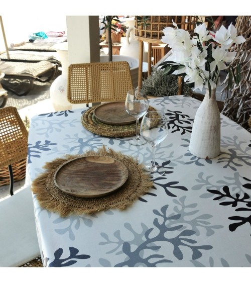 Matière : Coton enduit - Finition : Non ourlée (coupe franche) - La collection Corail prend des airs de tableau de Matisse. On y voit des formes abstraites ou bien des coraux pour un esprit bord de mer moderne et original. Ici, en gris et noir, le motif Corail est également décliné en 2 autres coloris. Nappe de table imperméable et anti-tache : La Nappe enduite Corail noir Fleur de Soleil est réalisée en coton enduit de haute qualité et résiste aux taches de toute la famille (vin, café, chocolat, sauce tomate, huile...) Fabrication 100% française : Le tissu Fleur de Soleil est tissé, blanchi, imprimé et enduit dans les Vosges, à Gérardmer. Tissu écologique : Impression du tissu certifiée Oeko-Tex classe I (les bébés peuvent le mettre à la bouche), enduction sans produits toxiques, sans PVC, sans phtalates Entreprise socialement responsable : les commandes sont réalisées et expédiées par un ESAT (Etablissement Spécialisé d'Aide par le travail) permettant à des handicapés de travailler en milieu ''protégé''. Nappe facile d'entretien : La Nappe enduite Corail noir s'entretient d'un coup d'éponge humide après chaque repas. Vinaigre d'alcool ou eau de Javel pour bien nettoyer. Lavage en machine possible occasionnellement à 30 C sans produit adoucissant ni essorage. Repassage obligatoire sur l'envers en position coton ou sur l'endroit avec une patte-mouille.