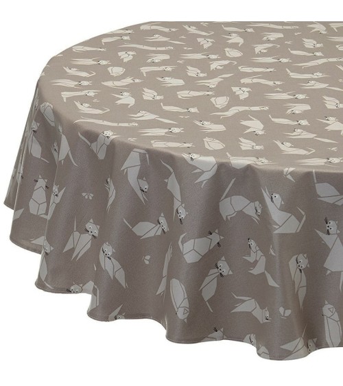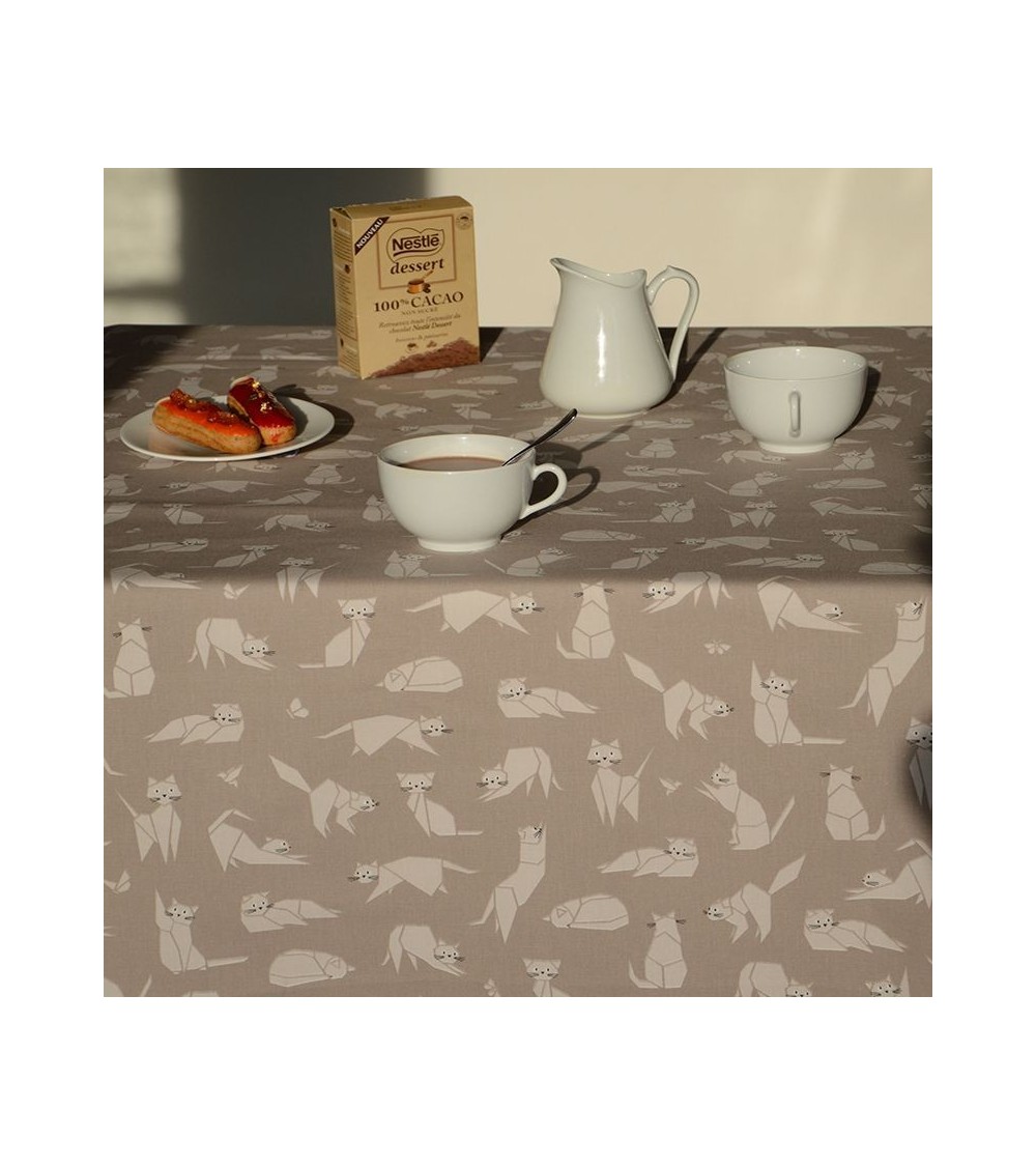 Matière : Coton enduit - Finition : Ourlée - La collection Chat est intemporelle et pourtant les chats reviennent sur le devant des catalogues de déco! Mignons, réconfortants les chats sont aimés ou détestés mais surtout ils plaisent aussi bien aux enfants qu'aux plus grands! Ici en taupe, le motif Chat est déclinés dans 2 autres coloris. Nappe de table imperméable et anti-tache : La Nappe enduite ronde ou ovale Chats taupe Fleur de Soleil est réalisée en coton enduit de haute qualité et résiste aux taches de toute la famille (vin, café, chocolat, sauce tomate, huile...) Fabrication 100% française : Le tissu Fleur de Soleil est tissé, blanchi, imprimé et enduit dans les Vosges, à Gérardmer. Tissu écologique : Impression du tissu certifiée Oeko-Tex classe I (les bébés peuvent le mettre à la bouche), enduction sans produits toxiques, sans PVC, sans phtalates Entreprise socialement responsable : les commandes sont réalisées et expédiées par un ESAT (Etablissement Spécialisé d'Aide par le travail) permettant à des handicapés de travailler en milieu ''protégé''. Nappe facile d'entretien : La Nappe enduite ronde ou ovale Chats taupe s'entretient d'un coup d'éponge humide après chaque repas. Vinaigre d'alcool ou eau de Javel pour bien nettoyer. Lavage en machine possible occasionnellement à 30 C sans produit adoucissant ni essorage. Repassage obligatoire sur l'envers en position coton ou sur l'endroit avec une patte-mouille.