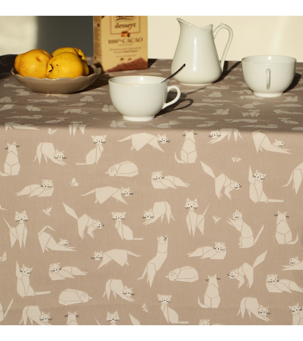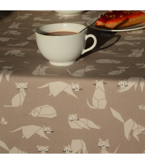 Matière : Coton enduit - Finition : Non ourlée (coupe franche) - La collection Chat est intemporelle et pourtant les chats reviennent sur le devant des catalogues de déco! Mignons, réconfortants les chats sont aimés ou détestés mais surtout ils plaisent aussi bien aux enfants qu'aux plus grands! Ici en taupe, le motif Chat est déclinés dans 2 autres coloris. Nappe de table imperméable et anti-tache : La Nappe enduite Chats taupes Fleur de Soleil est réalisée en coton enduit de haute qualité et résiste aux taches de toute la famille (vin, café, chocolat, sauce tomate, huile...) Fabrication 100% française : Le tissu Fleur de Soleil est tissé, blanchi, imprimé et enduit dans les Vosges, à Gérardmer. Tissu écologique : Impression du tissu certifiée Oeko-Tex classe I (les bébés peuvent le mettre à la bouche), enduction sans produits toxiques, sans PVC, sans phtalates Entreprise socialement responsable : les commandes sont réalisées et expédiées par un ESAT (Etablissement Spécialisé d'Aide par le travail) permettant à des handicapés de travailler en milieu ''protégé''. Nappe facile d'entretien : La Nappe enduite Chats taupes s'entretient d'un coup d'éponge humide après chaque repas. Vinaigre d'alcool ou eau de Javel pour bien nettoyer. Lavage en machine possible occasionnellement à 30 C sans produit adoucissant ni essorage. Repassage obligatoire sur l'envers en position coton ou sur l'endroit avec une patte-mouille.