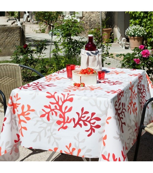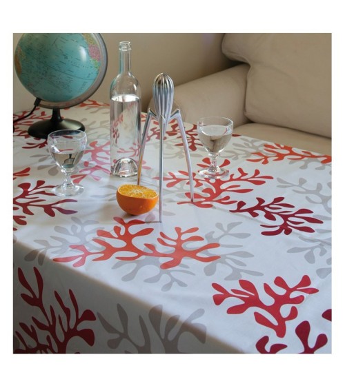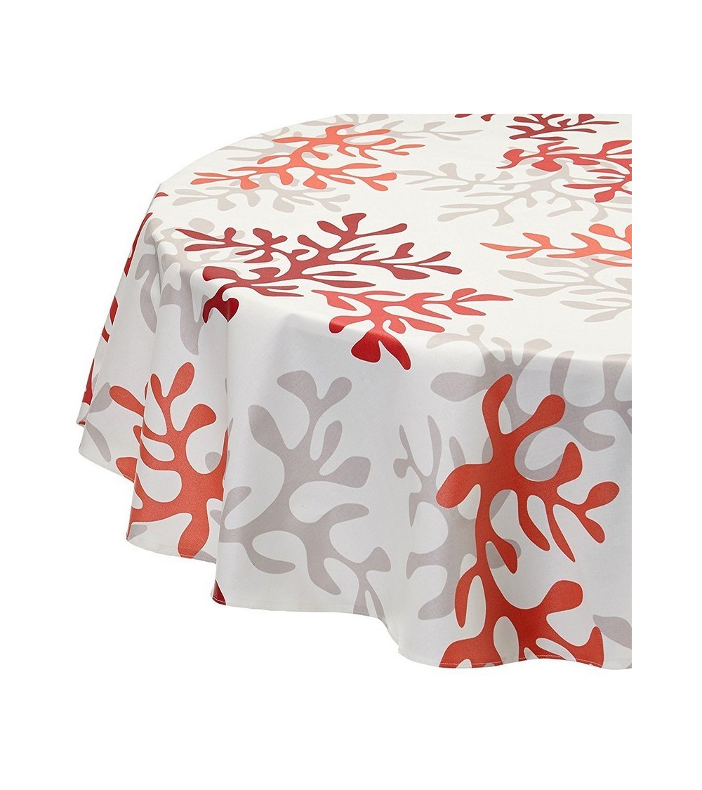 Matière : Coton enduit - Finition : Ourlée - La collection Corail prend des airs de tableau de Matisse. On y voit des formes abstraites ou bien des coraux pour un esprit bord de mer moderne et original. Ici, en rouge, le motif Corail est également décliné en 2 autres coloris. Nappe de table imperméable et anti-tache : La Nappe enduite ronde ou ovale Corail rouge Fleur de Soleil est réalisée en coton enduit de haute qualité et résiste aux taches de toute la famille (vin, café, chocolat, sauce tomate, huile...) Fabrication 100% française : Le tissu Fleur de Soleil est tissé, blanchi, imprimé et enduit dans les Vosges, à Gérardmer. Tissu écologique : Impression du tissu certifiée Oeko-Tex classe I (les bébés peuvent le mettre à la bouche), enduction sans produits toxiques, sans PVC, sans phtalates Entreprise socialement responsable : les commandes sont réalisées et expédiées par un ESAT (Etablissement Spécialisé d'Aide par le travail) permettant à des handicapés de travailler en milieu ''protégé''. Nappe facile d'entretien : La Nappe enduite ronde ou ovale Corail rouge s'entretient d'un coup d'éponge humide après chaque repas. Vinaigre d'alcool ou eau de Javel pour bien nettoyer. Lavage en machine possible occasionnellement à 30 C sans produit adoucissant ni essorage. Repassage obligatoire sur l'envers en position coton ou sur l'endroit avec une patte-mouille.