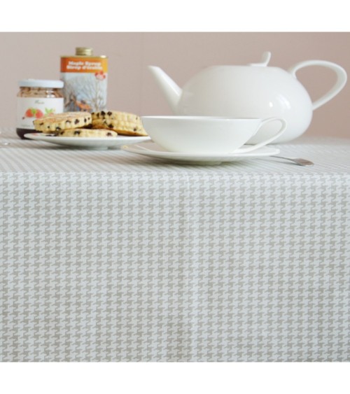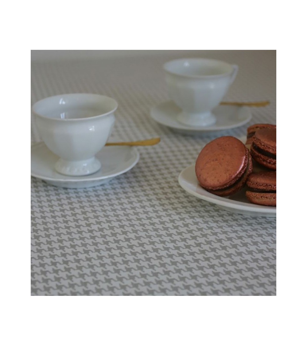 Matière : Coton enduit - Finition : Non ourlée (coupe franche) - Nappe de table imperméable et anti-tache : La Nappe enduite Pied de Poule gris Fleur de Soleil est réalisée en coton enduit de haute qualité et résiste aux taches de toute la famille (vin, café, chocolat, sauce tomate, huile...) Fabrication 100% française : Le tissu Fleur de Soleil est tissé, blanchi, imprimé et enduit dans les Vosges, à Gérardmer. Tissu écologique : Impression du tissu certifiée Oeko-Tex classe I (les bébés peuvent le mettre à la bouche), enduction sans produits toxiques, sans PVC, sans phtalates Entreprise socialement responsable : les commandes sont réalisées et expédiées par un ESAT (Etablissement Spécialisé d'Aide par le travail) permettant à des handicapés de travailler en milieu ''protégé''. Nappe facile d'entretien : La Nappe enduite Pied de Poule gris s'entretient d'un coup d'éponge humide après chaque repas. Vinaigre d'alcool ou eau de Javel pour bien nettoyer. Lavage en machine possible occasionnellement à 30 C sans produit adoucissant ni essorage. Repassage obligatoire sur l'envers en position coton ou sur l'endroit avec une patte-mouille.