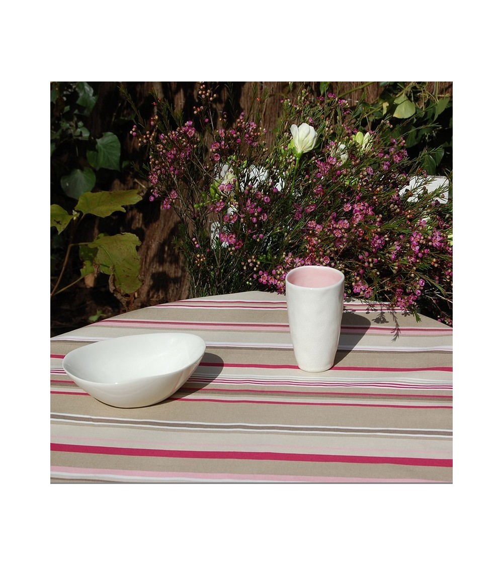 Matière : Coton enduit - Finition : Ourlée - La collection de nappes rayées donnent un côté toile basque à vos intérieurs qui sont réchauffés par le soleil du sud. Nappe de table imperméable et anti-tache : La Nappe enduite ronde ou ovale Rayure taupe Fleur de Soleil est réalisée en coton enduit de haute qualité et résiste aux taches de toute la famille (vin, café, chocolat, sauce tomate, huile...) Fabrication 100% française : Le tissu Fleur de Soleil est tissé, blanchi, imprimé et enduit dans les Vosges, à Gérardmer. Tissu écologique : Impression du tissu certifiée Oeko-Tex classe I (les bébés peuvent le mettre à la bouche), enduction sans produits toxiques, sans PVC, sans phtalates Entreprise socialement responsable : les commandes sont réalisées et expédiées par un ESAT (Etablissement Spécialisé d'Aide par le travail) permettant à des handicapés de travailler en milieu ''protégé''. Nappe facile d'entretien : La Nappe enduite ronde ou ovale Rayure taupe s'entretient d'un coup d'éponge humide après chaque repas. Vinaigre d'alcool ou eau de Javel pour bien nettoyer. Lavage en machine possible occasionnellement à 30 C sans produit adoucissant ni essorage. Repassage obligatoire sur l'envers en position coton ou sur l'endroit avec une patte-mouille.