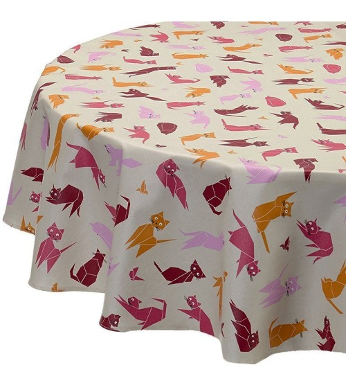 Matière : Coton enduit - Finition : Ourlée - La collection Chat est intemporelle et pourtant les chats reviennent sur le devant des catalogues de déco! Mignons, réconfortants les chats sont aimés ou détestés mais surtout ils plaisent aussi bien aux enfants qu'aux plus grands! Ici en rose et orange, le motif Chat est déclinés dans 2 autres coloris. Nappe de table imperméable et anti-tache : La Nappe enduite ronde ou ovale Chats rose Fleur de Soleil est réalisée en coton enduit de haute qualité et résiste aux taches de toute la famille (vin, café, chocolat, sauce tomate, huile...) Fabrication 100% française : Le tissu Fleur de Soleil est tissé, blanchi, imprimé et enduit dans les Vosges, à Gérardmer. Tissu écologique : Impression du tissu certifiée Oeko-Tex classe I (les bébés peuvent le mettre à la bouche), enduction sans produits toxiques, sans PVC, sans phtalates Entreprise socialement responsable : les commandes sont réalisées et expédiées par un ESAT (Etablissement Spécialisé d'Aide par le travail) permettant à des handicapés de travailler en milieu ''protégé''. Nappe facile d'entretien : La Nappe enduite ronde ou ovale Chats rose s'entretient d'un coup d'éponge humide après chaque repas. Vinaigre d'alcool ou eau de Javel pour bien nettoyer. Lavage en machine possible occasionnellement à 30 C sans produit adoucissant ni essorage. Repassage obligatoire sur l'envers en position coton ou sur l'endroit avec une patte-mouille.