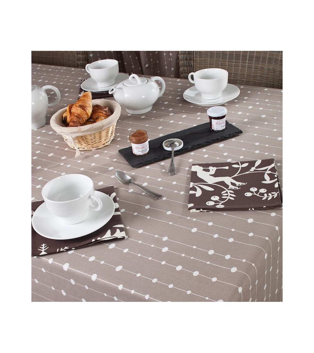 Matière : Coton enduit - Finition : Ourlée - Nappe de table imperméable et anti-tache : La Nappe enduite ronde ou ovale Perles taupe Fleur de Soleil est réalisée en coton enduit de haute qualité et résiste aux taches de toute la famille (vin, café, chocolat, sauce tomate, huile...) Fabrication 100% française : Le tissu Fleur de Soleil est tissé, blanchi, imprimé et enduit dans les Vosges, à Gérardmer. Tissu écologique : Impression du tissu certifiée Oeko-Tex classe I (les bébés peuvent le mettre à la bouche), enduction sans produits toxiques, sans PVC, sans phtalates Entreprise socialement responsable : les commandes sont réalisées et expédiées par un ESAT (Etablissement Spécialisé d'Aide par le travail) permettant à des handicapés de travailler en milieu ''protégé''. Nappe facile d'entretien : La Nappe enduite ronde ou ovale Perles taupe s'entretient d'un coup d'éponge humide après chaque repas. Vinaigre d'alcool ou eau de Javel pour bien nettoyer. Lavage en machine possible occasionnellement à 30 C sans produit adoucissant ni essorage. Repassage obligatoire sur l'envers en position coton ou sur l'endroit avec une patte-mouille.