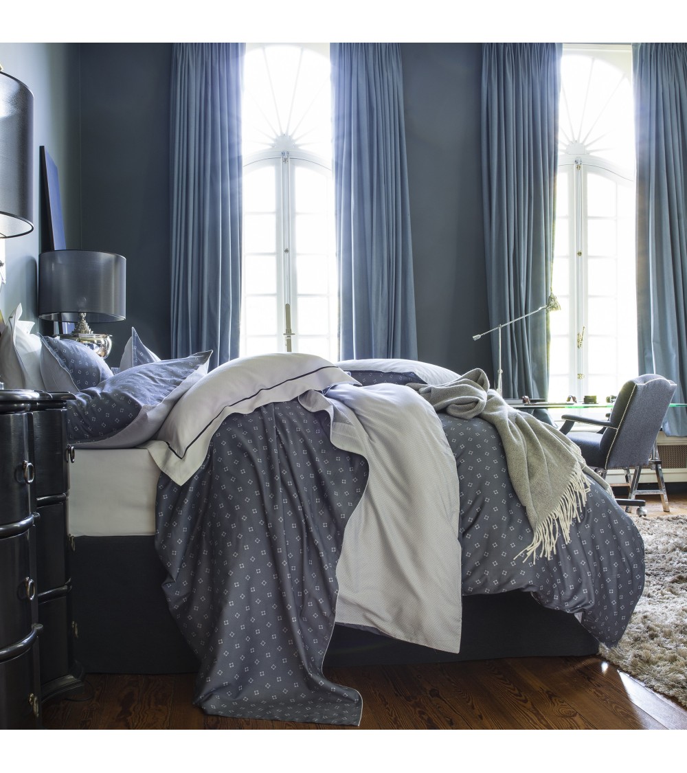 Le modèle Nocturne fait appel aux codes de l'éternel masculin. Un micro-motif pêché dans un vestiaire masculin et qui pourtant résonne comme l'un de ces prodigieux clichés stellaires. Ce petit motif carré semble être formé par l'explosion d'éclats lumineux avec, en son centre, un point d'une densité insondable. Le déploiement des ces motifs est assuré sur un fond bleu sombre pareil à l'obscurité étincelante des ciels nocturnes. Le coordonné évoque un effet de tissage ''micro T'' et amène un contrepoint léger à l'imprimé principal.La housse de couette, à finition bouteille, se compose d'une face dans le motif principal et d'une face dans le motif coordonné.