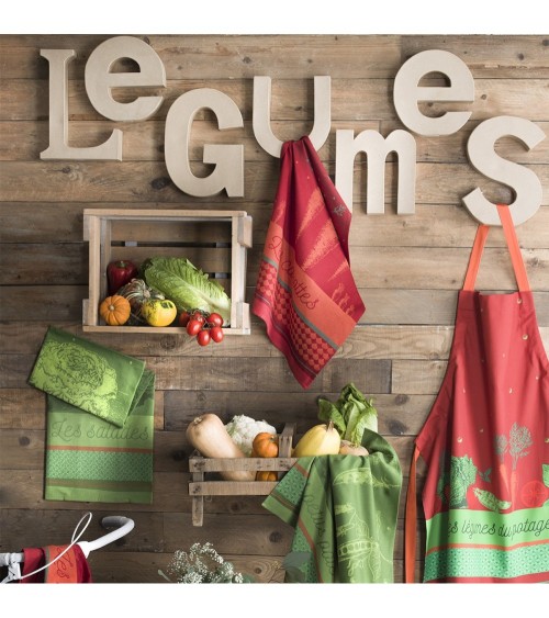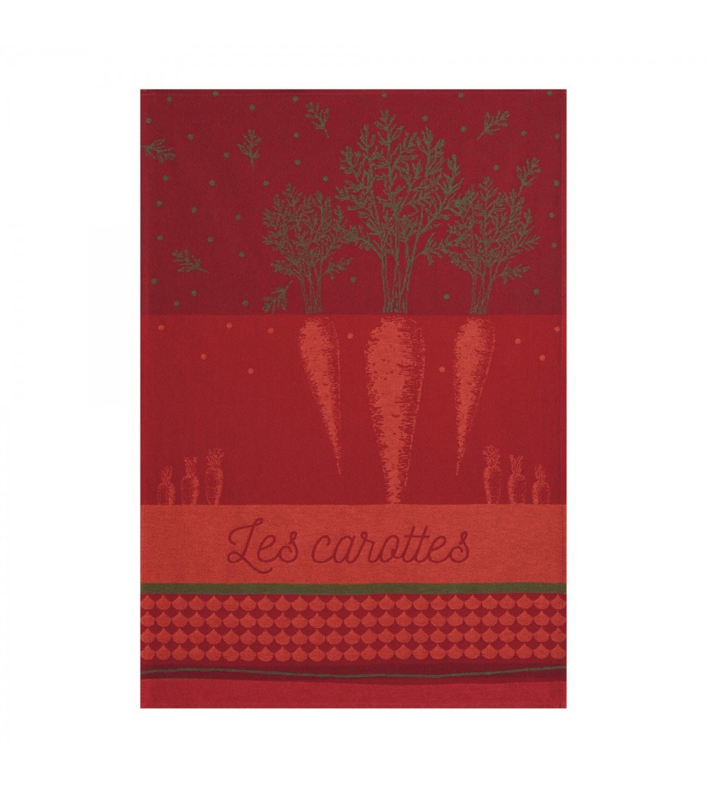 Torchon de cuisine, en jacquard de coton orné de carottes sur un fond orange et rouge, nous rappellant le potager été comme hiver.