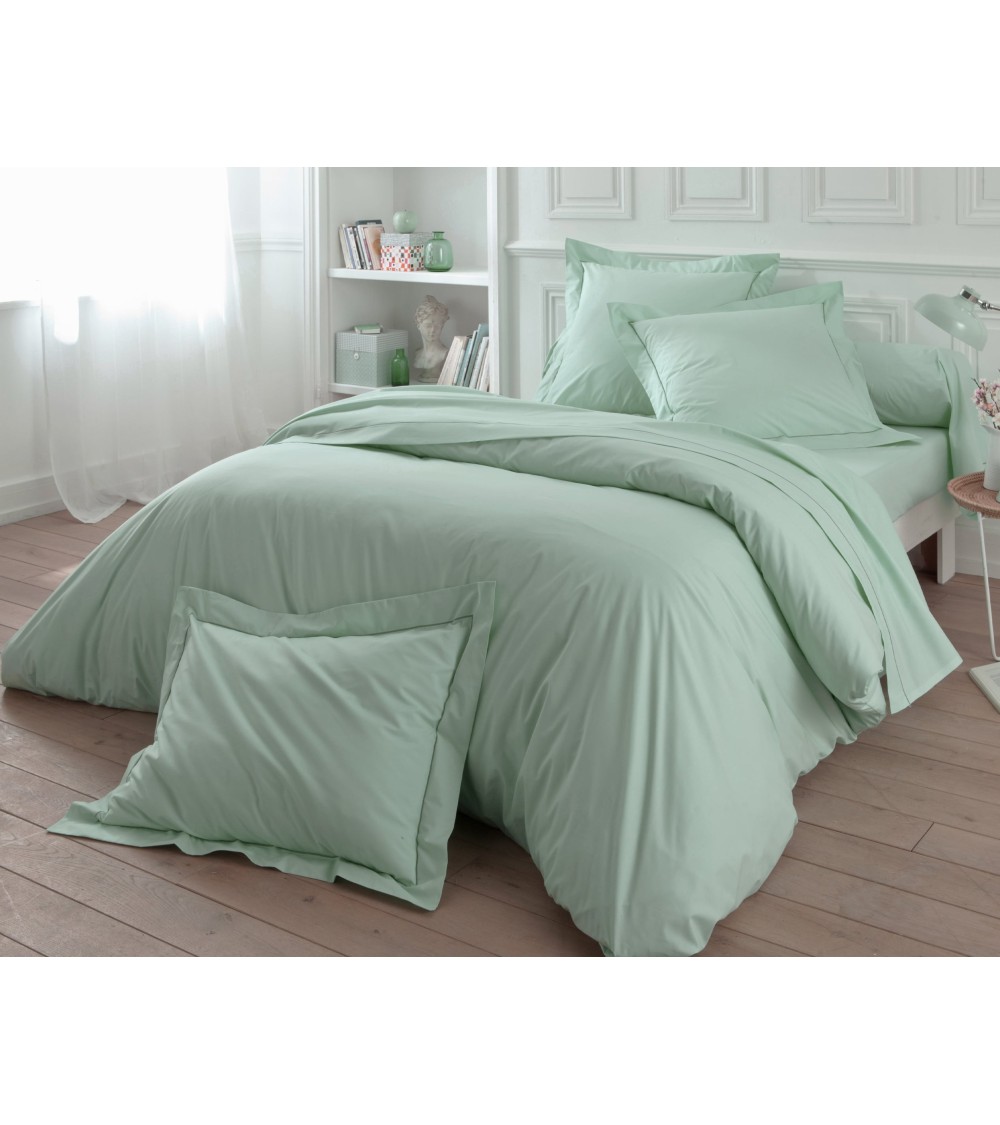 Dormir dans du linge de lit tout doux, cest bien comme cela, que commence une bonne nuit de sommeil Choisissez la PERCALE - Housse de couette en coton vert céladon 260x240. Du linge de lit en pur coton percale unie, au tissage de 80 fils/cm2. En effet, la percale se distingue par son toucher plus souple et plus soyeux que le tissage coton classique. Cette housse de couette est munie dun rabat de 40 cm. Elle est traitée Easy Care, ce qui facilite le repassage, lavable à 95° pour le blanc et 60° pour les couleurs.