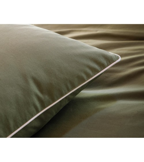Craquez pour le charme de JULIE - Taie d'oreiller en coton vert kaki 50x70, une taie d'oreiller rectangulaire en percale de pur coton au tissage serré de 80 fils/cm2, lavable à 60°. Ce linge de lit de qualité se pare de broderies sur un côté et finition par passepoil contrastant. De jolies broderies sont mises en valeur par un fond uni kaki, un jeu de contraste, pile dans les tendances du moment !