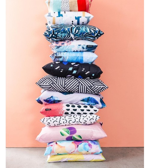 Housse de coussin imprimée en continu (all-over) avec son coussin de garnissage. Matière hypoallergénique. Peut être produit en trois tailles différentes. Porte une fermeture éclair.