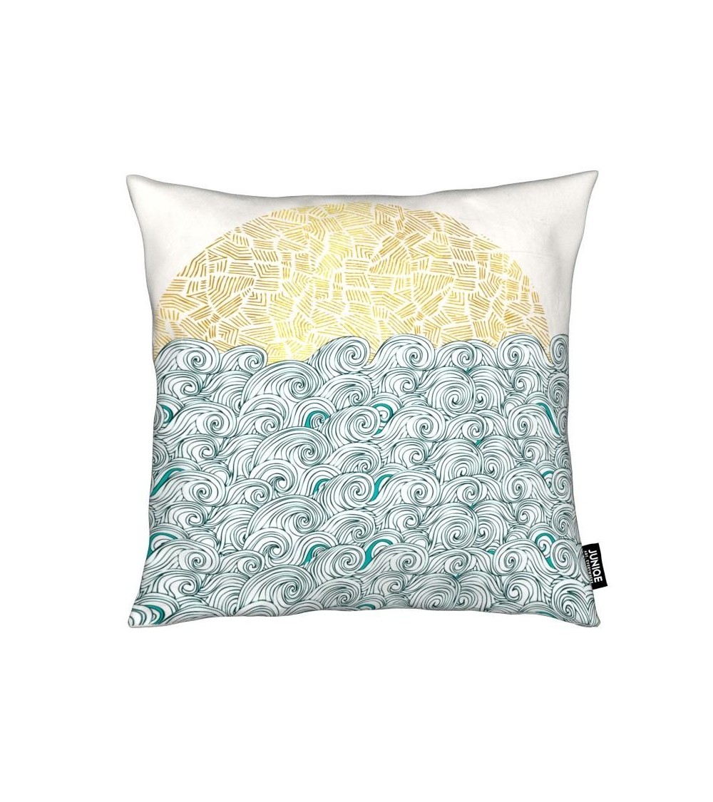Housse de coussin imprimée en continu (all-over) avec son coussin de garnissage. Matière hypoallergénique. Peut être produit en trois tailles différentes. Porte une fermeture éclair.