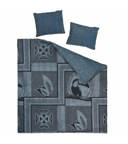 Housse de couette en coton percale. Un gros toucan superposé sur un motif denim dans une combinaison de couleurs bleu ton sur ton pour une ambiance indigo profond. Lavage à 60 degrés max. Malagoon est une marque qui souhaite que vous conserviez ce doux sentiment dêtre en vacances toute l'année. Et si vous pouviez vous détendre après une longue journée de travail dans une décoration insulaire relaxante? Malagoon peut rapprocher ce rêve, en commençant dans votre propre chambre. L'ensemble de la gamme respire une atmosphère détendue et ensoleillée. Elle est facile à mélanger et à assortir dans et autour de la maison. Malagoon produit ses créations en petites quantités, laissant beaucoup de place à la créativité. C'est un must absolu, permettant à la marque de garder la flexibilité de créer des produits uniques et exclusifs. La devise de la marque: Liberez votre esprit!