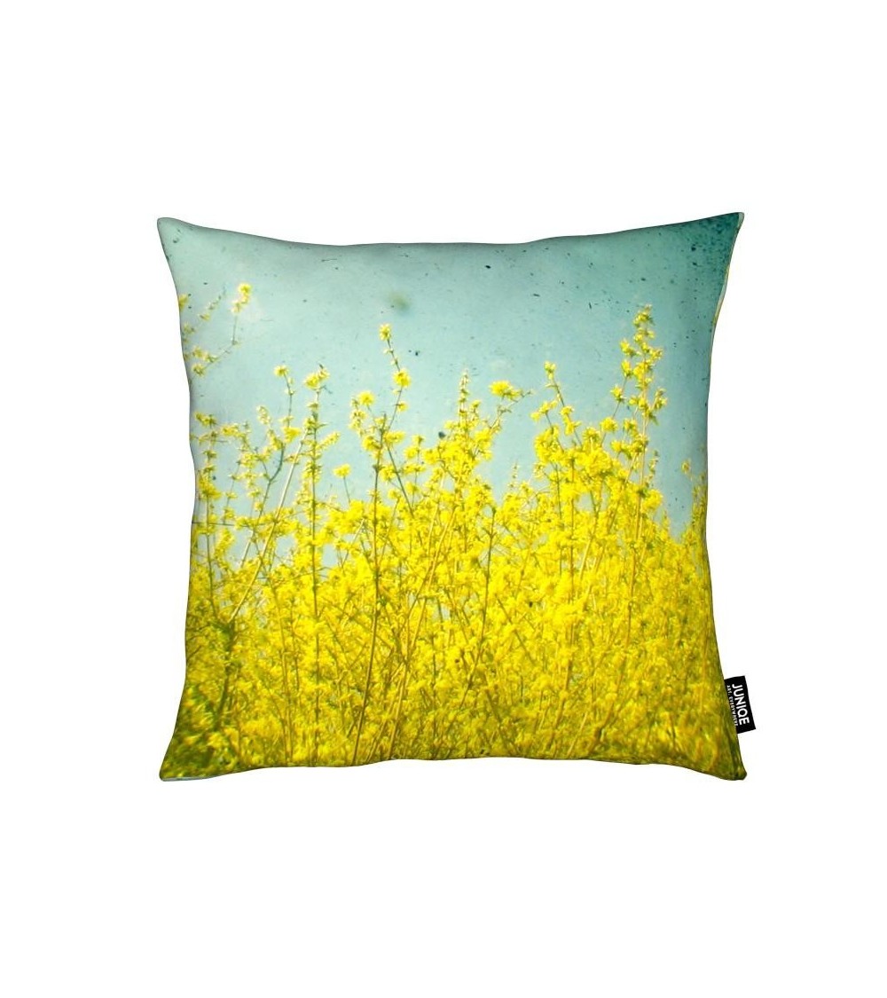 Housse de coussin imprimée en continu (all-over) avec son coussin de garnissage. Matière hypoallergénique. Peut être produit en trois tailles différentes. Porte une fermeture éclair.