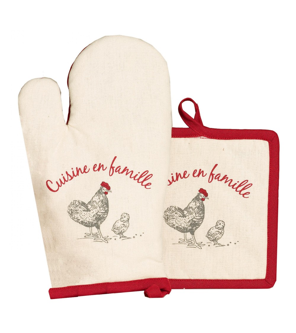 Gant de cuisine + Manique En famille en coton ivoire 18 x 28