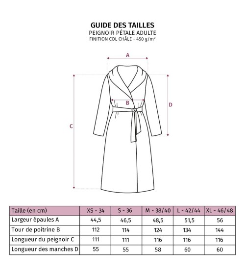 Pétale est une gamme phare de linge de bain Anne de Solène, qui se décline dans plus de 20 teintes afin de répondre au mieux aux besoins et envies de couleurs de chacun.Le tissu est rigoureusement sélectionné, ainsi nous utilisions exclusivement des fibres longues pour confectionner notre gamme de linge de bain Pétale ce qui la rend trés résistante. Afin de la magnifier, nous avons apposé un liteau ton sur ton sur chacun des articles qui compose la gamme.En éponge 100% coton peigné, d'un grammage de 450 gr/m², ce peignoir col châle garantit une absorption maximale tout en restant léger et agréable à porter. De plus, il est composé de deux poches discrètes ainsi que d'une ceinture sous passants pour vous permettre de passer de véritables moments de détente. Agrémenté de finitions extrêmement soignées, ce peignoir est un produit d'exception.Ce joli peignoir est également disponible dans d'autres coloris. Choisissez celui que vous préférez et associez-le avec d'autres produits de la gamme Pétale : serviettes, tapis de bain, gant de toilette...Conseils d'entretien :Le produit est lavable à 60° et séchable en machine à température modérée - suivez les instructions sur la vignette d'entretien