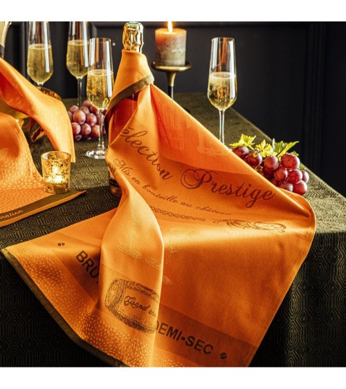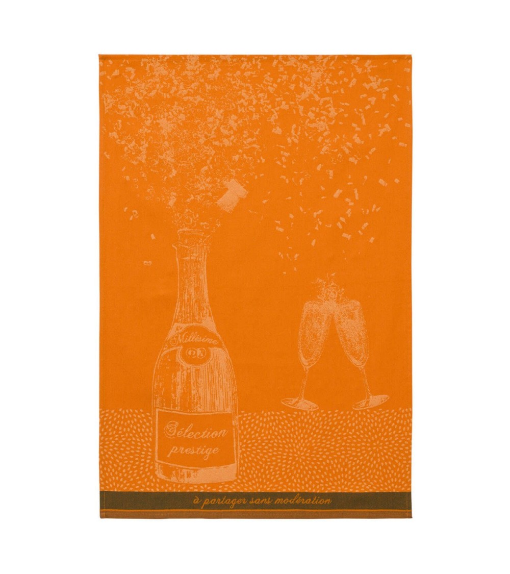 Ce torchon en 100% coton, sur un fond chaleureux orange est le torchon festif par excellence ! On retrouve l'univers du champagne retranscrit avec la bouteille et les coupes : idéal pour des fêtes et moments conviviaux.