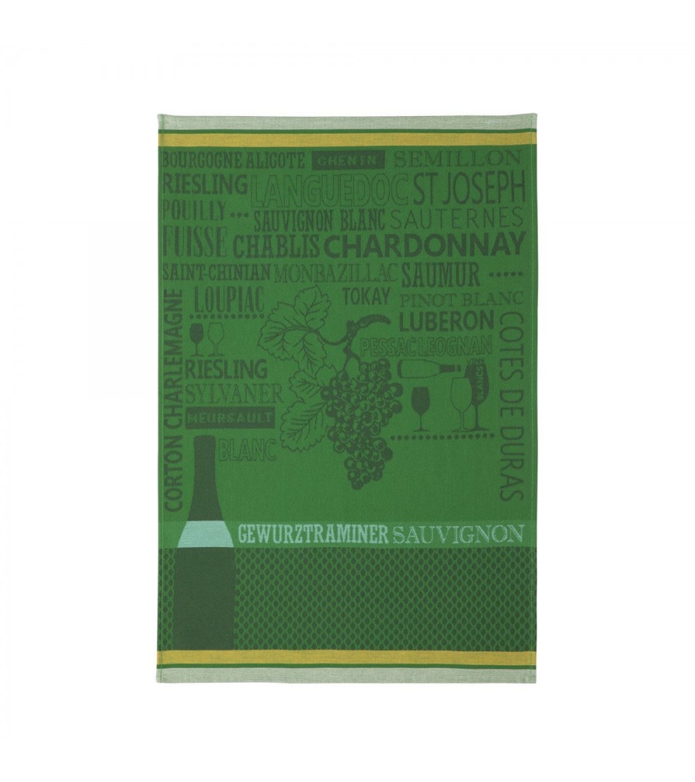 Le torchon en jacquard de coton Chardonnay, expose différents noms et cépages de vin blanc, qui entourent une grappe de raisin.