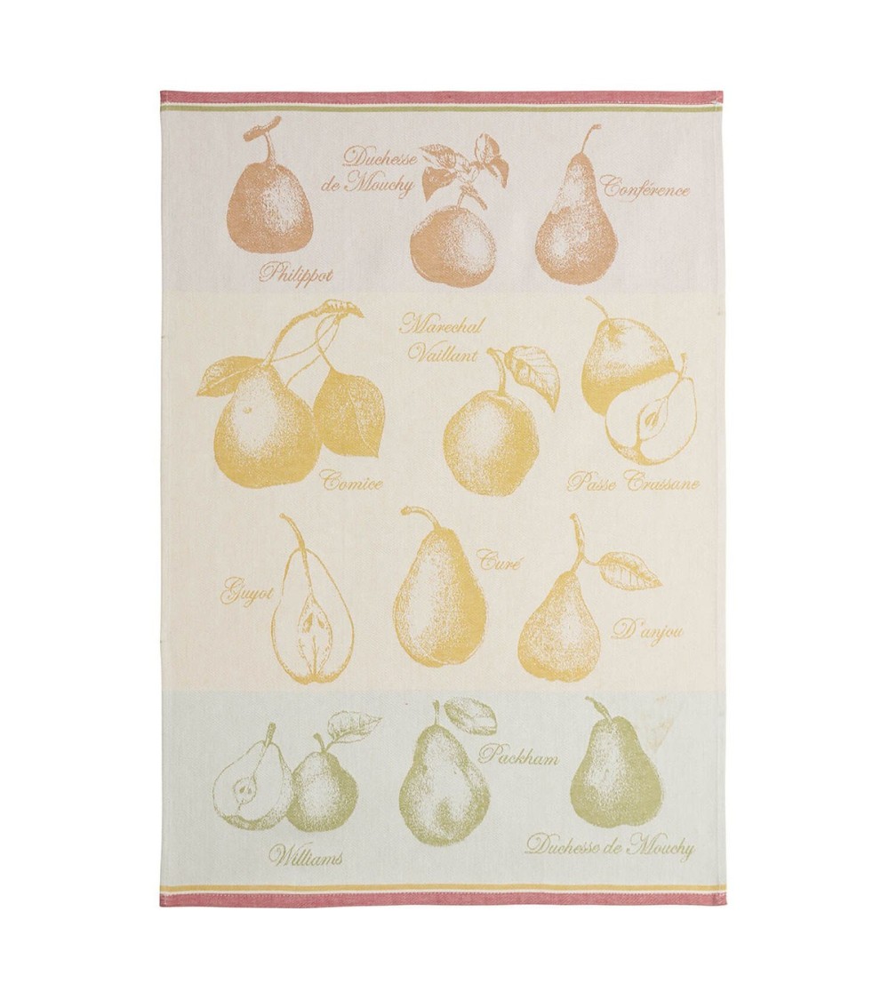 Ce torchon 100% coton met en scène un fruit aux nombreuses vertus : la poire. Dans différents tons de beige, rouge, jaune, et vert, ce torchon met en lumière ce fruit.