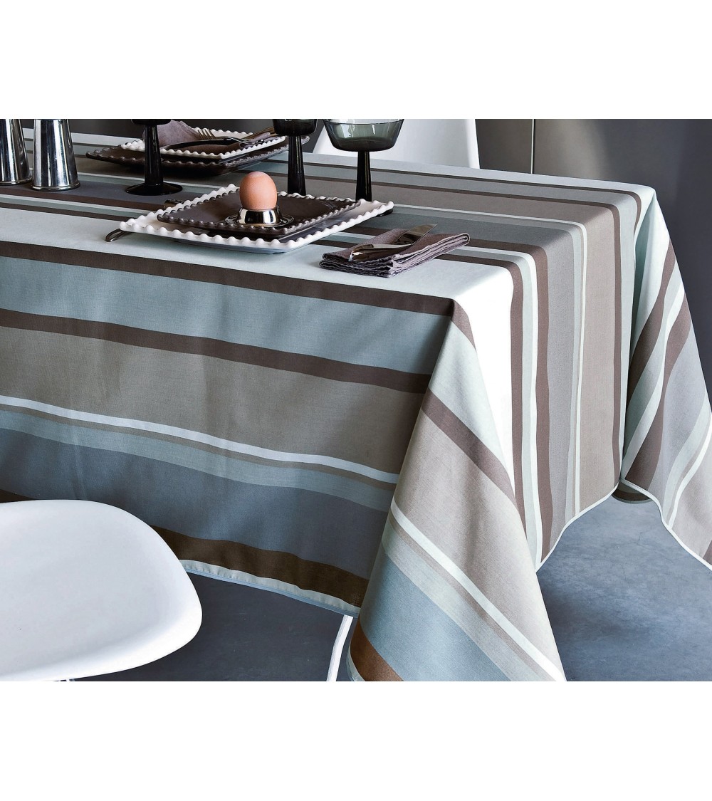 Choisissez la gaité des couleurs avec STRIBER - Nappe rectangulaire en coton bleu grisé 150x250, une nappe rayée en polycoton enduit facile à vivre ! Déperlante, la nappe en polycoton, polyester et coton, enduit se nettoie à léponge et protège la table des maladresses. Rapidement essuyés avec une éponge humide, liquide et taches ne pénètrent pas dans les fibres ; lenduction est constituée dacrylique.