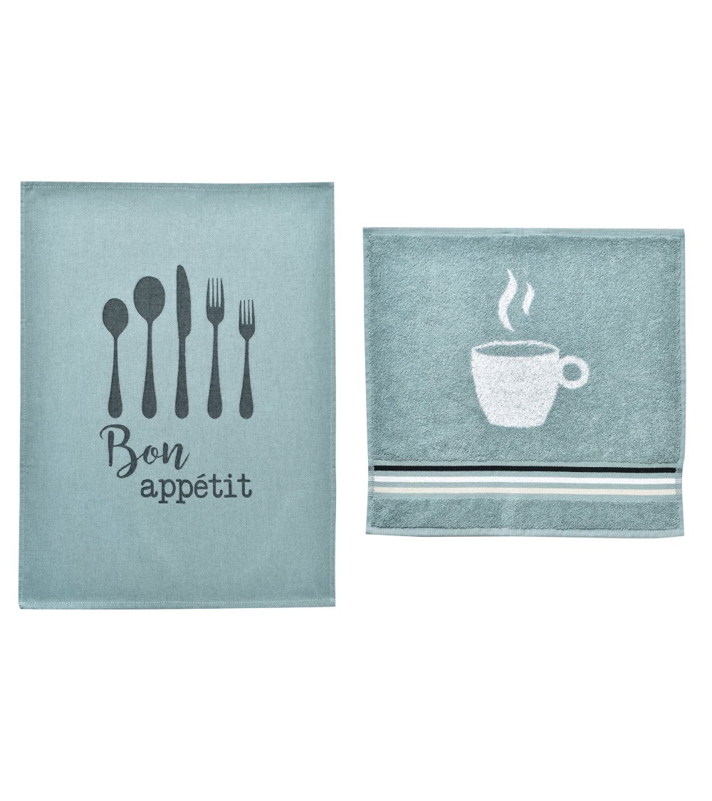 Adoptez BON APPETIT - Torchons en bleu grisé 50x70 lot de 6, ce lot de torchons et dessuie-mains pour une cuisine toute pratique ! Une belle déclinaison pour des essuie-mains et torchons en pur coton de dimensions 50 x 70 cm Des essuie-mains 400 g/m² et torchons 230 g/m² conçus dans un pur coton lavable à 40°. Ce lot de 3 essuie-mains + 3 torchons sera votre complice au quotidien, pratiques et dignes daccessoires déco !