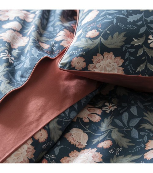 Le modèle Fairy Blossom réinterprète à sa façon le floral exubérant façon William Morris, pour une chambre tendance et raffinée. Au recto, vous trouverez ces sublimes motifs floraux travaillés sur un fond bleu marine, et au verso un uni bois de rose.
